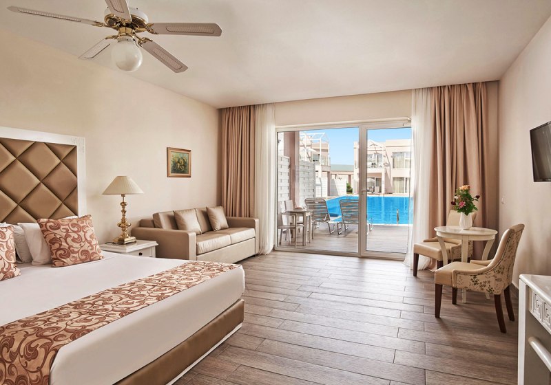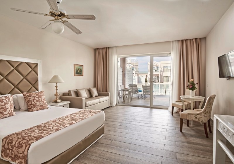 Die Zimmer und Suiten sind auf Ruhe und Funktionalität ausgelegt: Doppelbett und Sofa, Dusche/WC, Föhn, Bademantel, Slipper und Strandtücher stehen bereit. Individuell regulierbare Klimaanlage, WLAN, Sat-TV, Safe, Telefon und Mini-Kühlschrank gehören ebenso zur Ausstattung wie Kaffee-/Teezubereiter sowie Balkon oder Terrasse. Swim-up-Zimmer und Suiten bieten direkten Zugang zu Sharing Pools, ideal für ungestörte Stunden am Wasser.