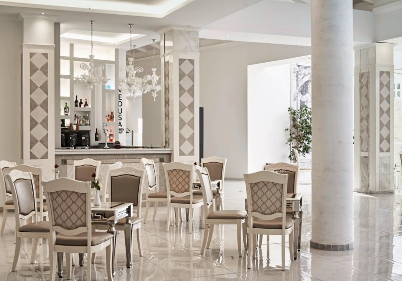 Ihr esst im Verbund: Die Hauptrestaurants Elia und Ammos liegen im Schwesterhotel Sandy Beach, die Poolbar Oasis befindet sich vor Ort. Kulinarisch stehen mehrere Verpflegungsoptionen bereit, von Frühstück über Halbpension bis All Inclusive. Live-Kochen bringt Frische an die Stationen, Snacks und Getränke sind klar strukturiert verfügbar.