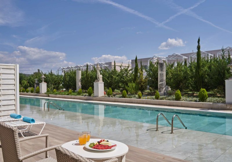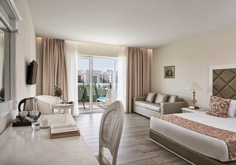 Juniorsuiten verfügen über einen separaten Wohnbereich, Suiten sind größer und mit Sharing Pool ausgelegt. Die Villen betonen Privatheit: zwei Schlafzimmer, zwei Wohnräume, zwei Bäder, ein möblierter Balkon mit Sonnenliegen und ein privater Pool. Ausblicke variieren zwischen Garten- und Poolbereichen, die Fliesenböden halten das Raumklima angenehm. Für strukturierte Aufenthalte zu zweit oder unter Freunden bieten die Kategorien klare Wahlmöglichkeiten. Highlight: Villen mit privatem Pool und großzügigen Grundrissen.