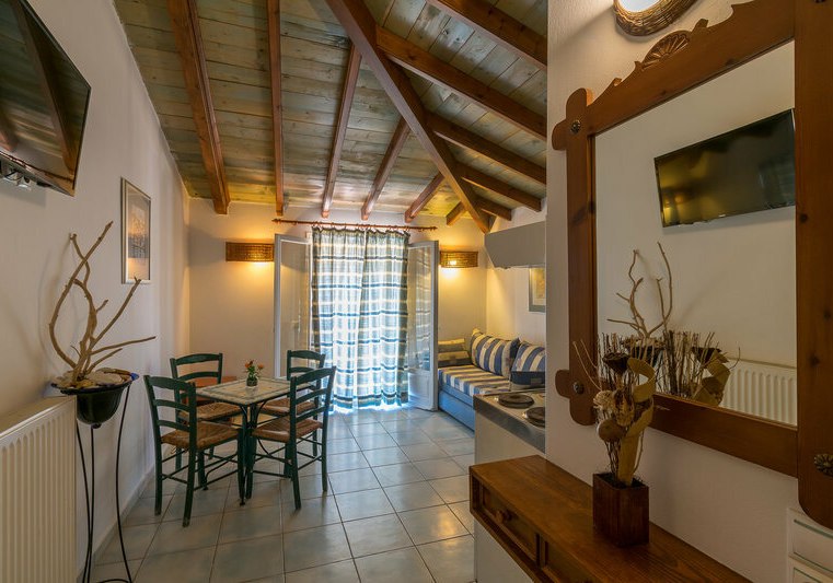 Der Kiesstrand von Dassia liegt rund 1 km entfernt; Wassersportangebote erreicht Ihr nach circa 800 m. Damit kombiniert Ihr entspannte Tage am Pool mit Bewegungseinheiten am Meer – passend für ruhige wie sportliche Aufenthalte.