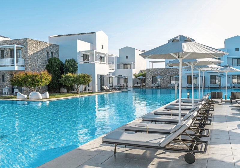 • Weitläufiger Pool: Großzügige Wasserfläche mit reichlich Liegen und Schirmen.