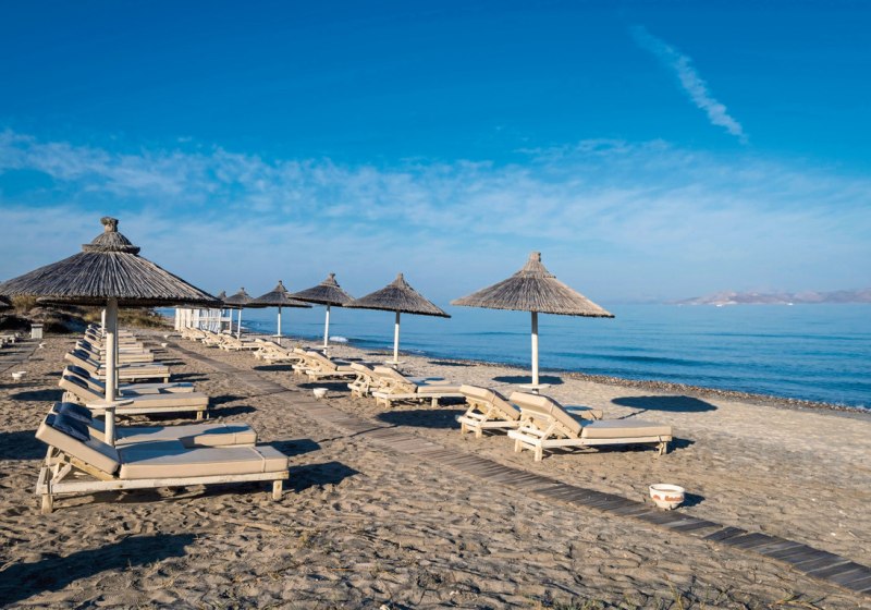 Ihr wohnt auf Kos, etwa 4 Kilometer von Kos-Stadt entfernt, mit direktem Bezug zum Meer. Der Strand liegt gleich gegenüber, nur durch die Küstenstraße getrennt. Liegen und Schirme stehen bereit, sodass Ihr den Übergang zwischen Poolbereich und Küste unkompliziert gestalten könnt.