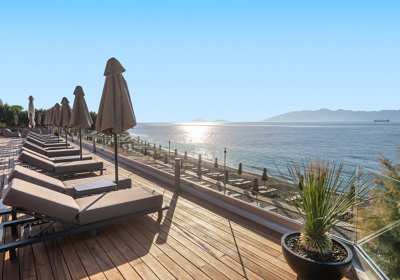 • Am Strand: Liegen, Schirme und Badetücher auch direkt am Kieselstrand.