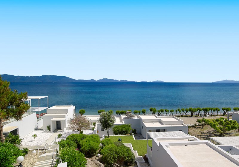 Ihr wohnt in Agios Fokas, direkt an einem rund 400 Meter langen Kieselstrand mit Liegen und Schirmen. Die Anlage staffelt sich in Hanglage, wodurch Ihr nah am Wasser und dennoch übersichtlich organisiert seid. Kos-Stadt liegt etwa 7 Kilometer entfernt, die Bushaltestelle befindet sich unmittelbar vor dem Hotel. Highlight: Strandlage mit schneller Anbindung an Kos-Stadt per Bus vor der Tür.