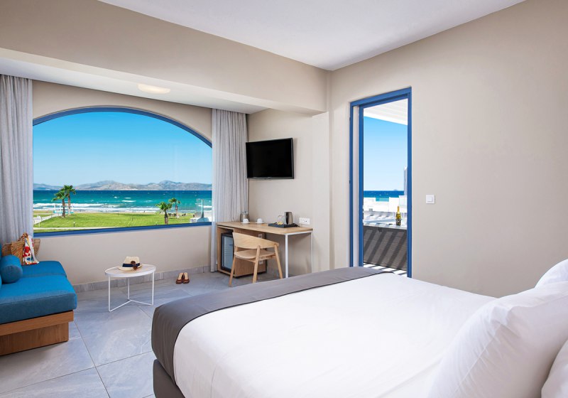 Ihr wählt zwischen Zimmern und Bungalows, teils mit Meerblick, alle mit Balkon oder Terrasse. Klimaanlage, Safe, Minikühlschrank, Kaffee-/Teezubereiter, Flat-Sat-TV und Telefon sind an Bord. Badezimmer mit Dusche/WC, Föhn und Pflegeprodukten; in bestimmten Kategorien Regendusche. Highlight: Juniorsuiten mit privatem Plungepool inklusive Whirlpoolfunktion.
