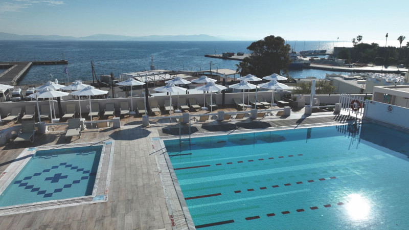 Im Kosta Palace City Hotel wohnt Ihr direkt am Hafen von Kos, mit freiem Blick auf die Johanniterfestung. Die Dachterrasse mit Pool und weitläufiger Sonnenterrasse wird schnell zum Lieblingsplatz, wenn Ihr zwischen Stadtflair und Meerblick abschalten wollt. Klare Linien, kurze Wege und ein angenehm urbanes Gefühl prägen den Aufenthalt.