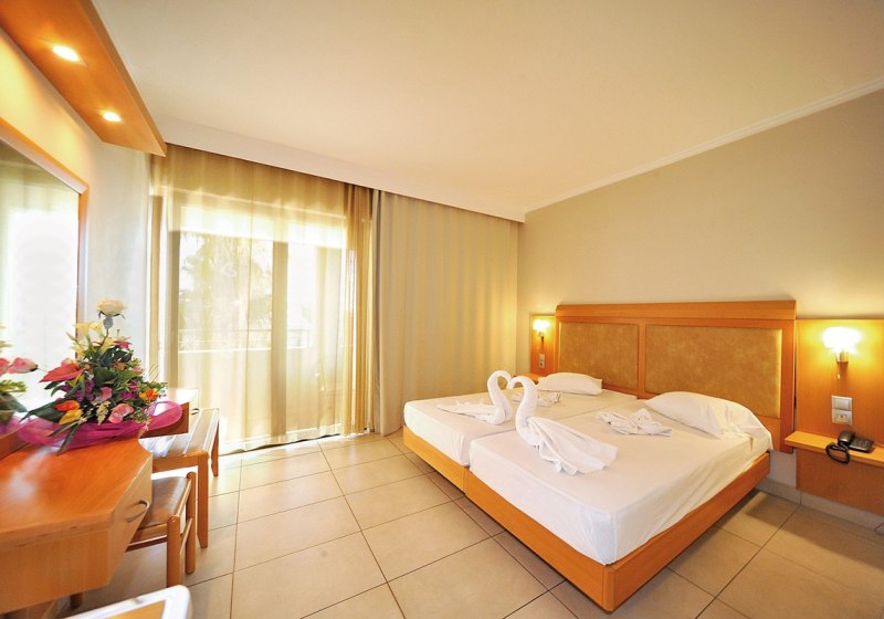 Die Zimmer sind auf Funktion und praktische Details ausgerichtet. Standardausstattung umfasst Dusche, Haartrockner, Flachbild‑Sat‑TV, Kühlschrank, Safe und Balkon oder Terrasse; die Klimaanlage ist gegen Gebühr nutzbar. Je nach Kategorie stehen Doppel‑ oder Twin‑Betten, Zustell‑ oder Kinderbett und bei Bedarf ein Schlafsofa bereit. Fliesenboden und klare Linien halten die Räume angenehm pflegeleicht.