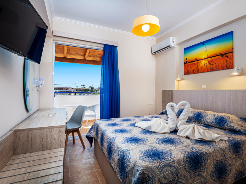 Ihr wählt zwischen klassischen Zimmern und Appartements. Alle Einheiten sind mit Bad oder Dusche/WC, Telefon, Klimaanlage, Minikühlschrank, Föhn, Sat.-/Flat-TV sowie Balkon oder Terrasse ausgestattet – praktisch für luftige Abende nach dem Strand. Das Design folgt der Funktion: klare Ausstattung, alles an seinem Platz.