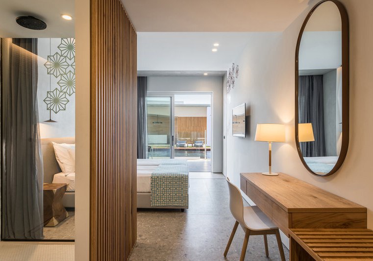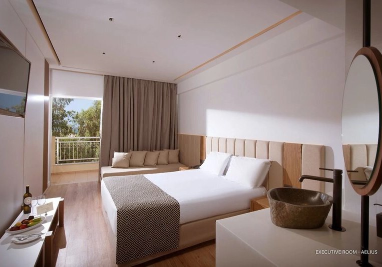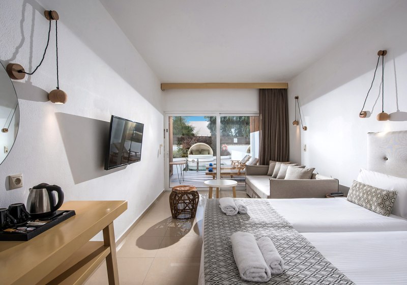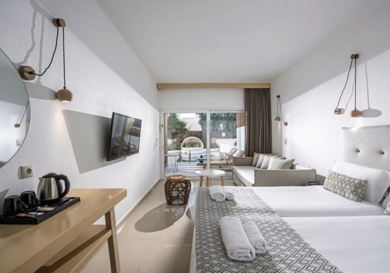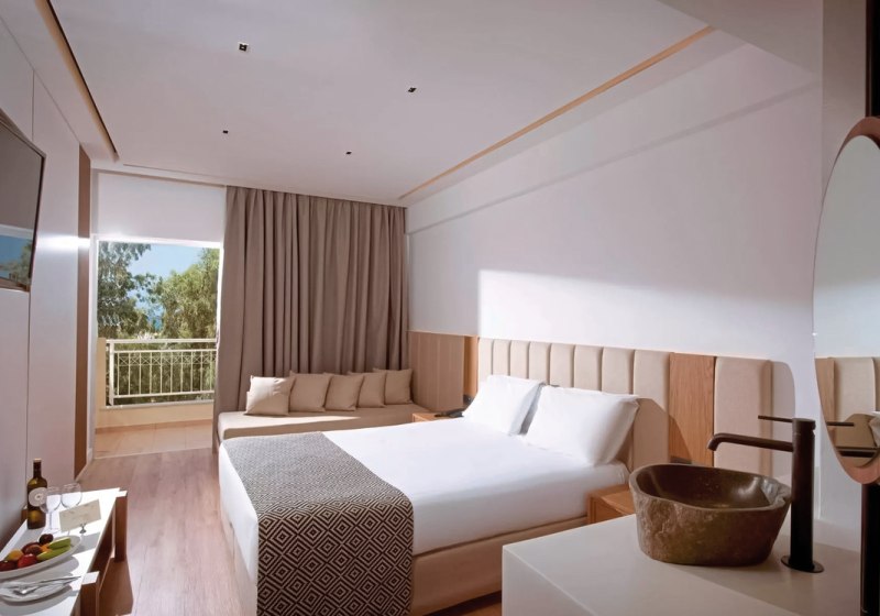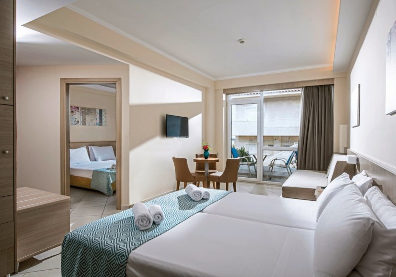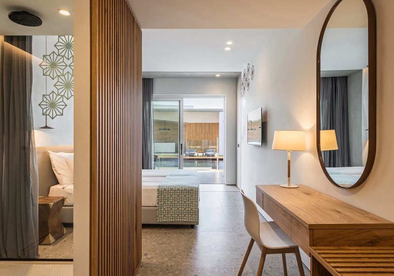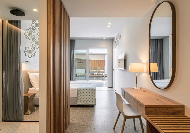 Die Zimmer im Aelius Hotel & Spa verbinden klare Linien mit praxisnahen Details. Familienzimmer bieten ein separates Schlafzimmer, während ausgewählte Einheiten mit privatem Pool für maximale Privatsphäre stehen. Balkon oder Terrasse öffnen den Blick auf Garten- oder Poolbereiche, Verdunkelungsvorhänge und Schallisolation sorgen für ruhige Nächte.