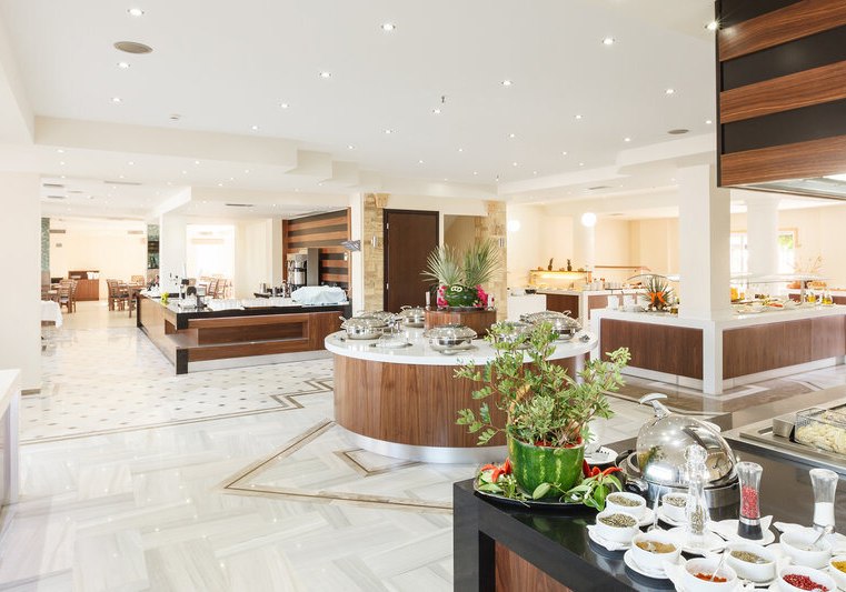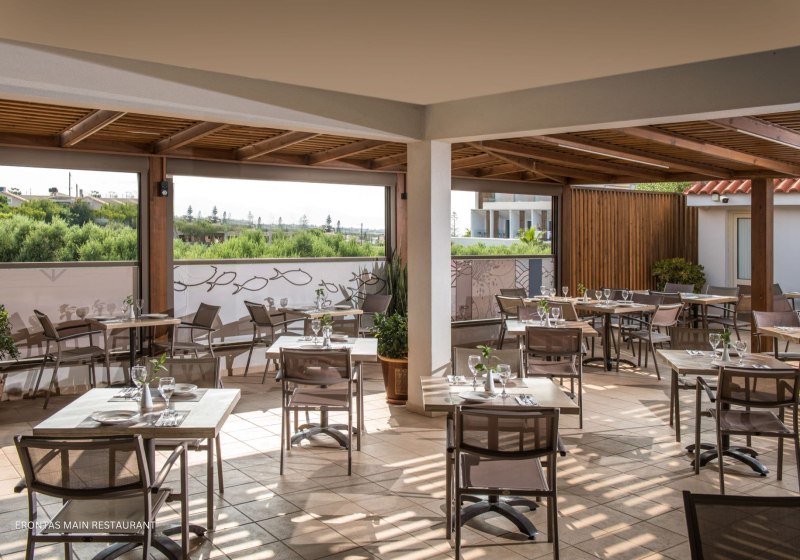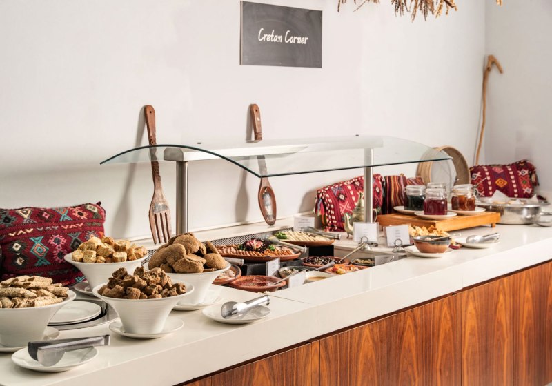 Im Hauptrestaurant Erontas wählt Ihr am Buffet, untermalt von Live-Kochen und vielfältigen Ernährungsoptionen von vegetarisch und vegan bis gluten- oder laktosefrei. Das à-la-carte-Restaurant Kritamos bringt kretische und mediterrane Küche an den Tisch – eine klare Stärke im Haus.