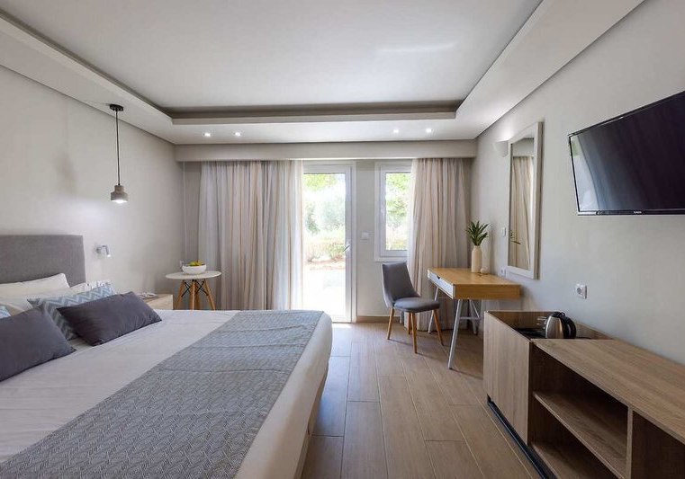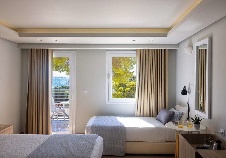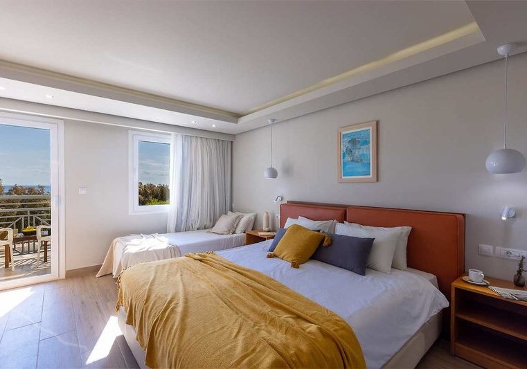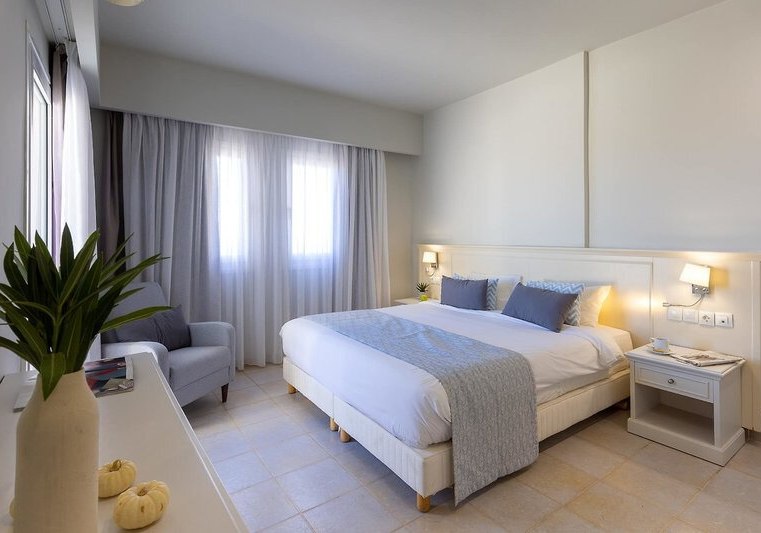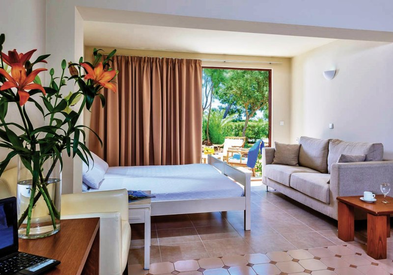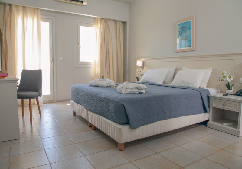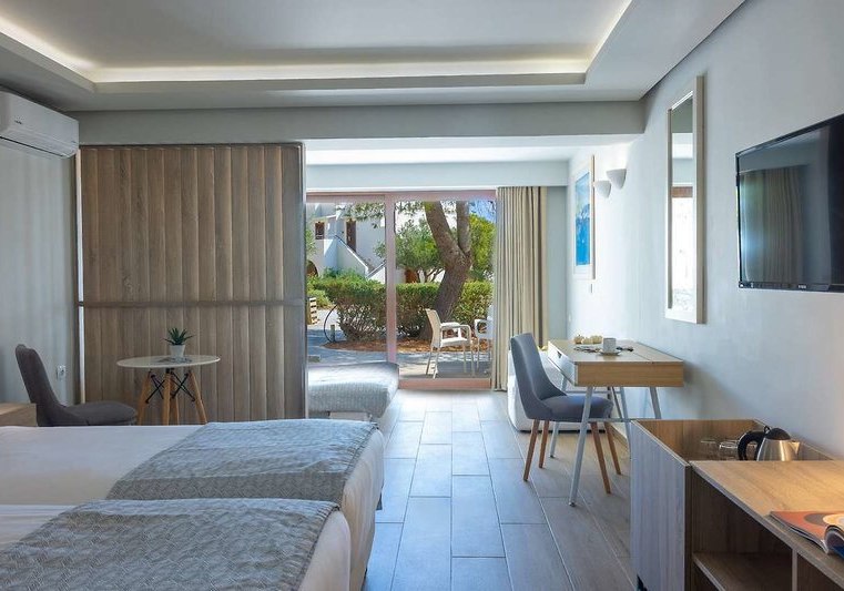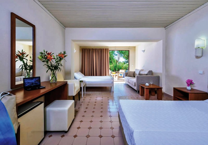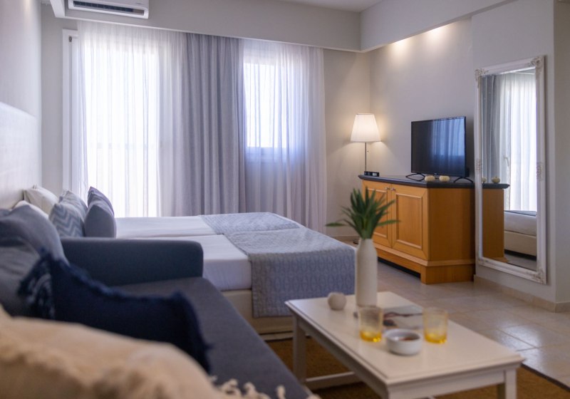 Die 231 Zimmer sind klar ausgestattet: Bad oder Dusche/WC, Föhn, Telefon, Sat‑TV, Klimaanlage, Kühlschrank und Mietsafe. Ihr wählt Balkon oder Terrasse mit Gartenblick, optional Meerblick oder direkte Strandlage. So entscheidet Ihr selbst, ob Ihr Morgensonne im Garten oder die Wellen vorn an der Kante wollt.