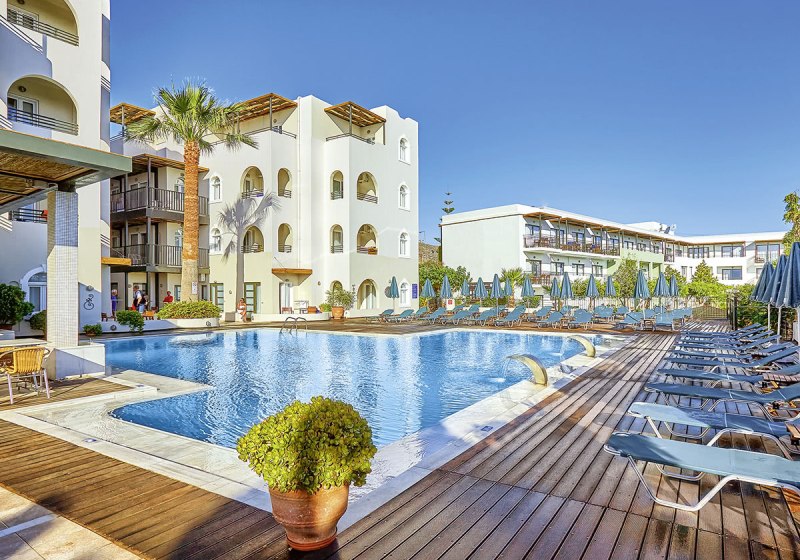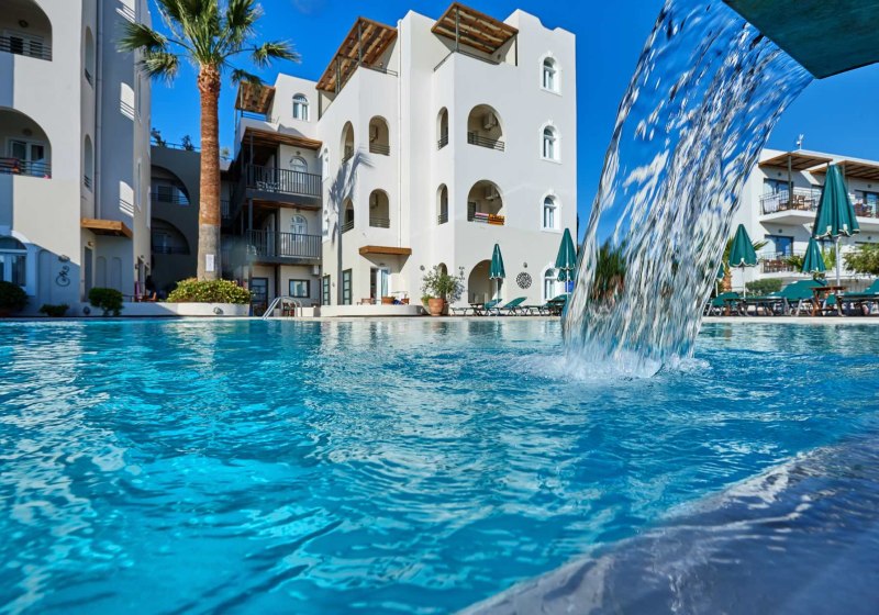 Die Anlage gliedert sich in Haupt- und Nebengebäude mit je drei Etagen und Aufzügen. Zentral liegen Lobby, 24-Stunden-Rezeption und Sat-TV-Ecke. Draußen entfalten sich vier Meerwasserpools, zwei separate Meerwasser-Kinderbecken und ein Wasserpark mit Rutschen. Sonnenterrassen, Außenmöbel und schattige Bereiche rhythmisieren den Tag. Highlight: Wasserpark und Pools bieten Vielfalt für jede Stimmung.