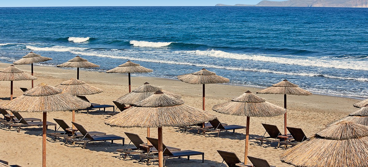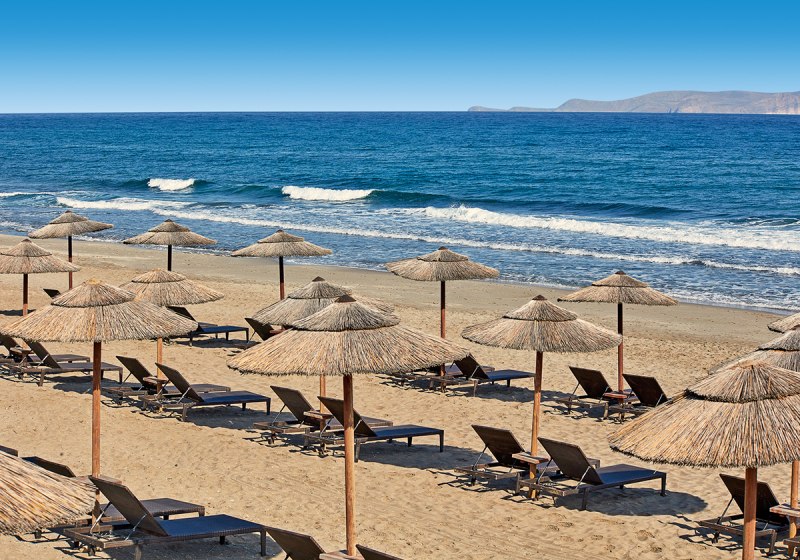 - Strandnähe pur: Direkte Lage am Sand-Kiesstrand Analipsi mit Liegen und Schirmen.