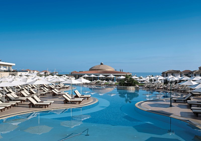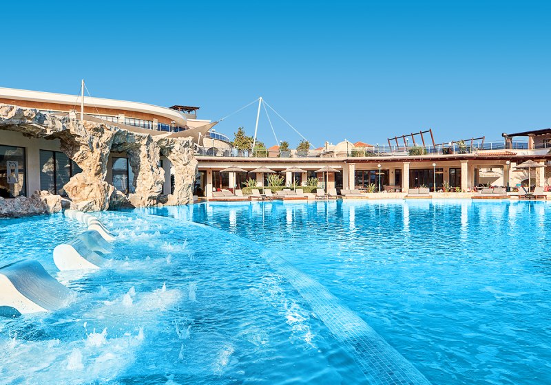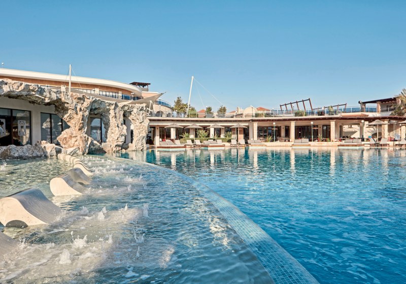 - Vier Außenpools: Weitläufige Wasserflächen mit Sonnenterrassen, Liegen und Handtuchservice.