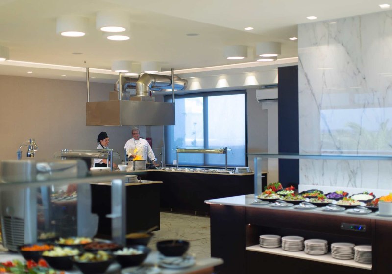 Im Hauptrestaurant wählt Ihr zwischen griechischer und internationaler Küche; auf der Außenterrasse schmeckt das Abendlicht zur Mahlzeit. Ergänzend versorgt Euch die Bar mit klassischer Getränkekarte, während die Pool-/Snackbar Zwischenstopps am Wasser erleichtert. So bleibt Ihr im Fluss Eures Tages.
