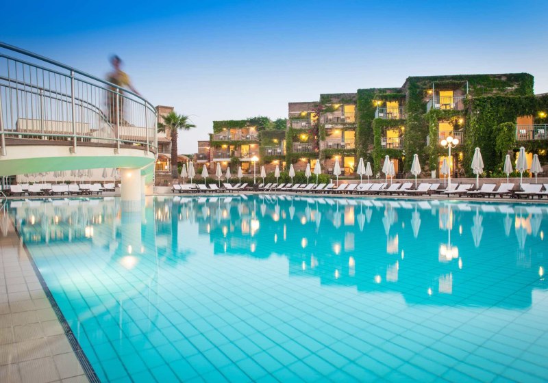 Die Anlage ist kompakt genug für kurze Wege und bietet zugleich Rückzugsorte: zwei Außenpools, ein Hallenbad und gepflegte Gartenbereiche. Das Team agiert präsent und aufmerksam, gestützt von 24-Stunden-Rezeption, Zimmerservice und vielfältigen Services von Minimarkt bis Friseur. Highlight: Direktlage am Strand mit inkludierten Liegen und Schirmen, dazu zwei Pools für entspannte Tage im Urlaub.