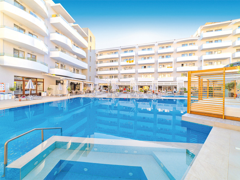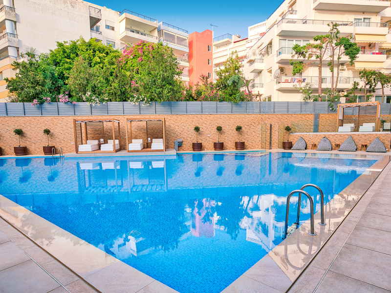 Im Bio Suites Hotel wohnt Ihr in einem Apartmenthotel, das Strandnähe und Stadtnähe verbindet. Studios und Appartements geben Euch Raum für unabhängige Tage, während Service und Infrastruktur eines 4‑Sterne‑Hauses den Rahmen setzen. Die 2023 erneuerte Lobby mit Bar und Restaurant wirkt frisch und aufgeräumt. Draußen warten Süßwasserpool und Kinderbecken, daneben eine ruhige Sonnenterrasse mit Liegen und Schirmen.