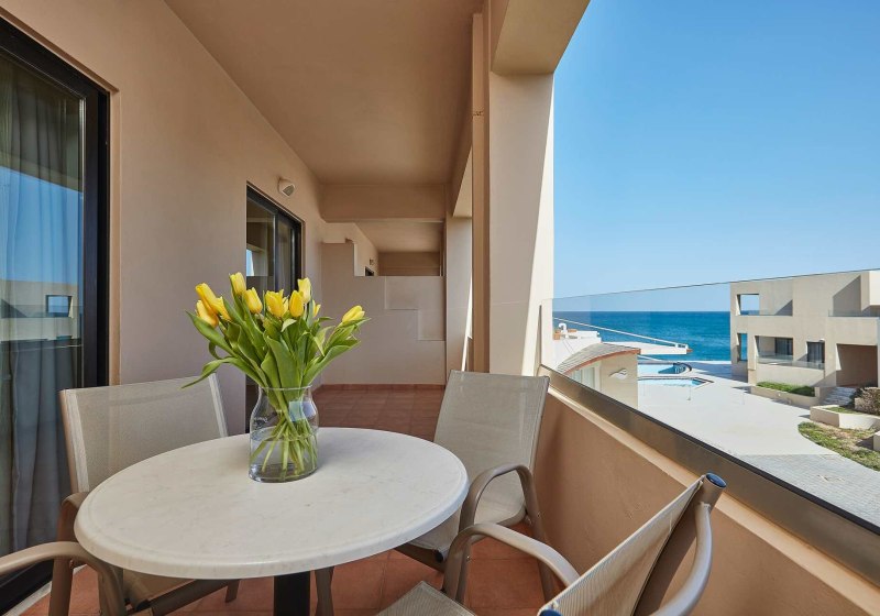 Alle Unterkünfte öffnen den Blick auf die Ägäis – ein klares Versprechen dieses Hauses. Möblierte Balkone holen Luft und Licht hinein, Verdunkelungsvorhänge sorgen nachts für Ruhe. Die individuellen Klimageräte regeln Temperatur ganz nach Eurem Empfinden. WLAN, Safe und LED‑TV mit Satellitenkanälen stehen bereit; ein Schreibtisch schafft Struktur für kleine To‑dos.