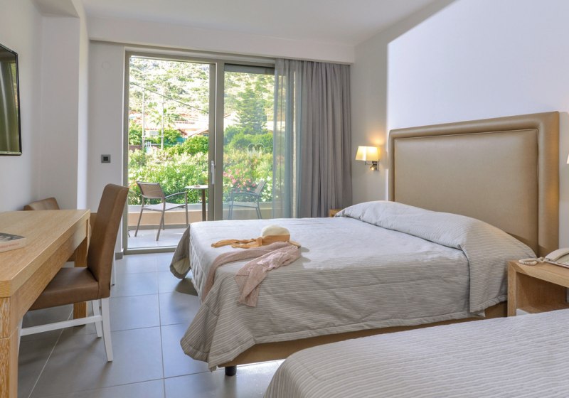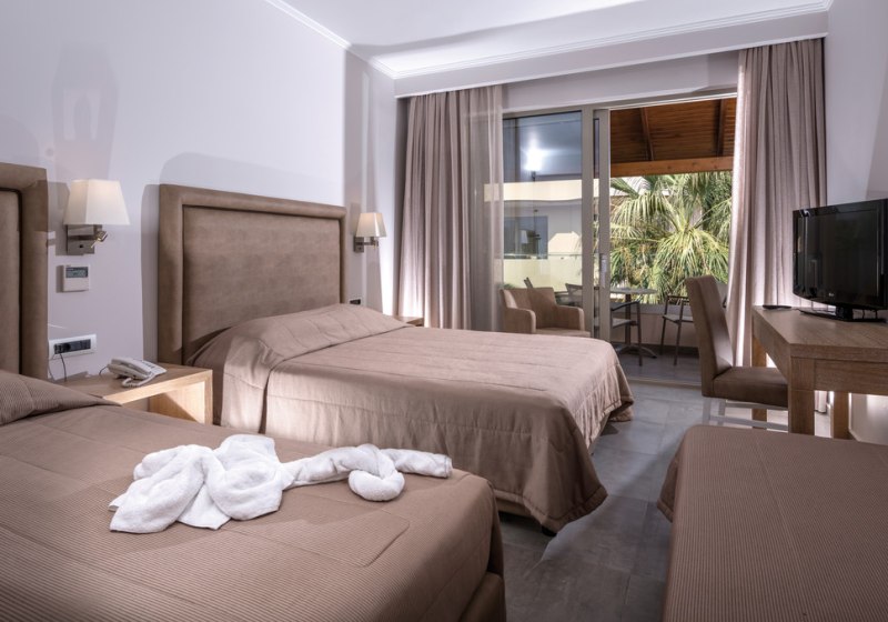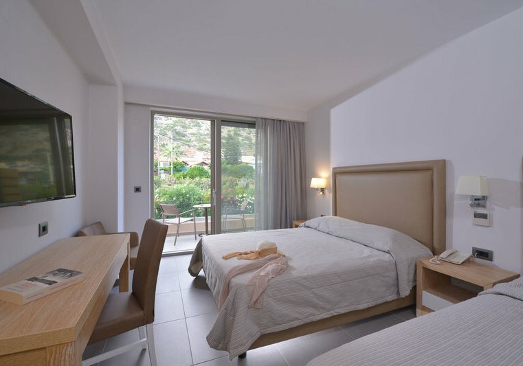 Ihr wohnt in Zimmern mit klarer Ausstattung für Strandtage: Dusche/WC, Föhn und individuell regulierbare Klimaanlage schaffen verlässlichen Komfort. Safe, Sat‑TV, Telefon, Wi‑Fi und Minikühlschrank sind an Bord; Balkon oder Terrasse öffnen den Blick nach draußen, teils in die Gartenbereiche.