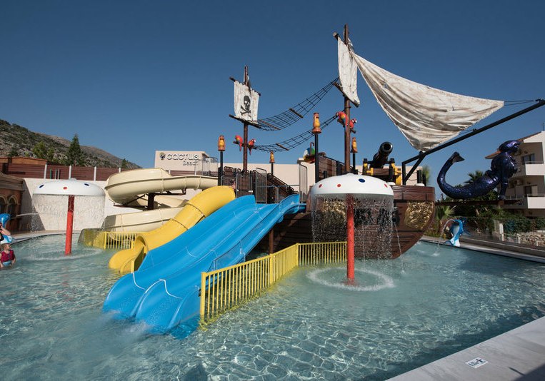 Im Cactus Beach Hotel & Bungalows wohnt Ihr in einer weitläufigen Anlage, die wie ein kleines Feriendorf wirkt. Gepflegte Wege führen zu drei Süßwasserpools, Sonnenterrassen und einem lebhaften Wasserpark mit zwei großen Rutschen sowie einem Piratenschiff mit drei kleineren Rutschen. Das Herzstück: das Amphitheater für abendliche Shows. Familien finden reichlich Platz und Angebote, Paare schätzen die klar strukturierte Umgebung und die direkte Nähe zum Strand, der nur durch die Küstenstraße getrennt liegt.