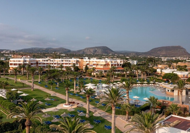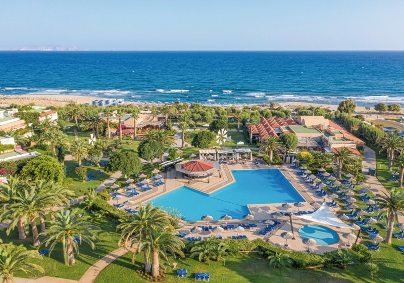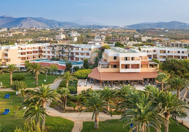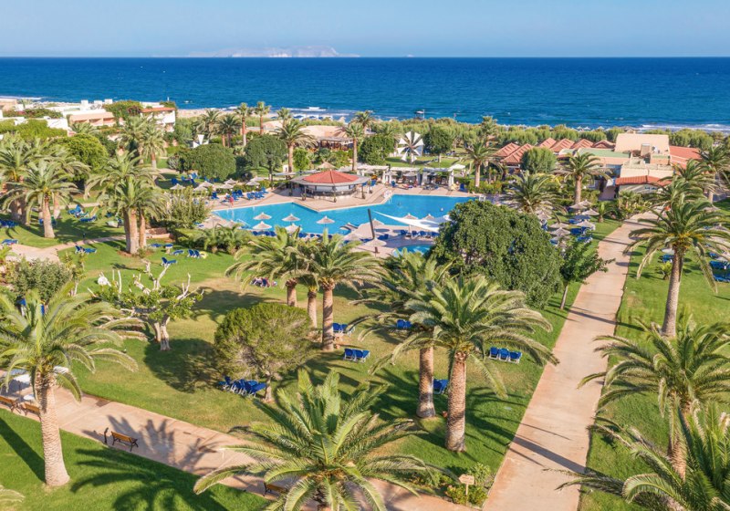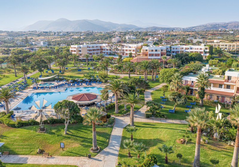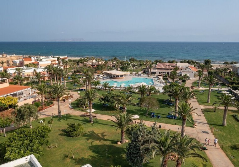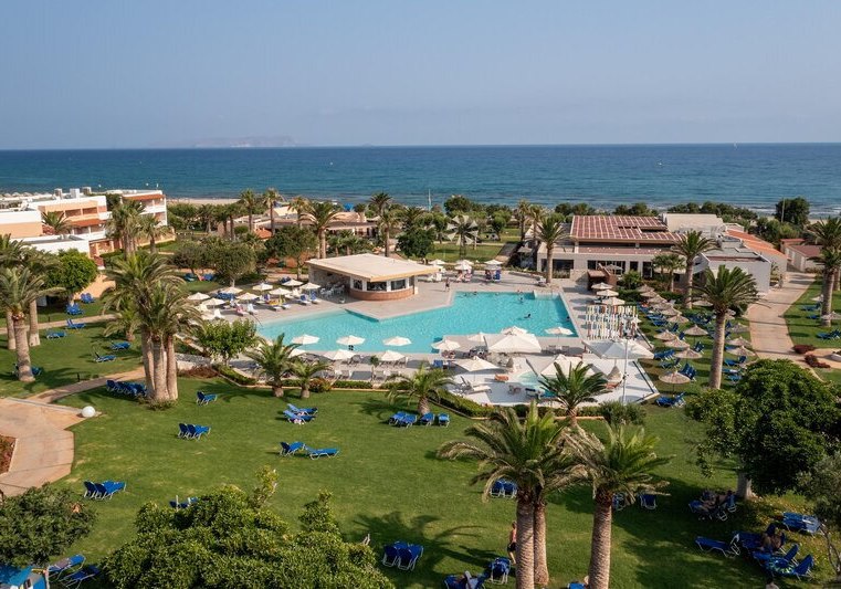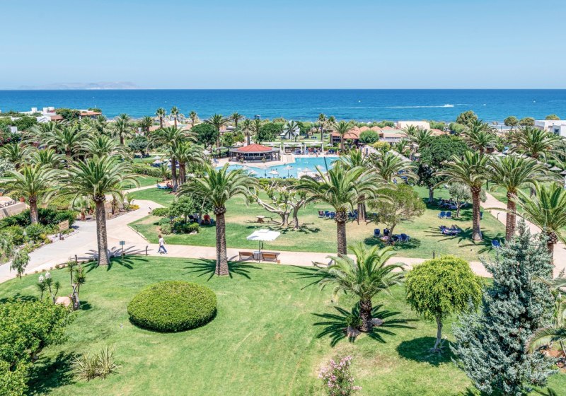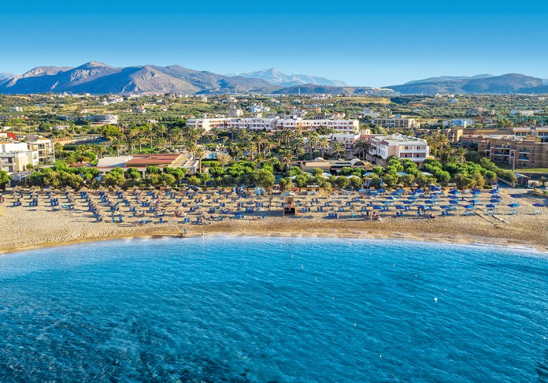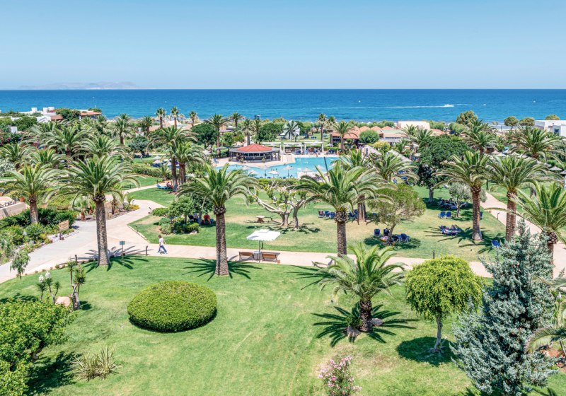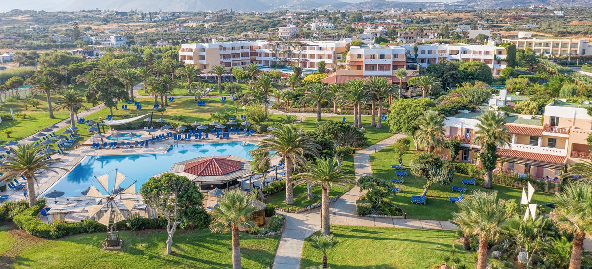 Im Anissa Beach & Village Hotel wohnt Ihr direkt am Sand- und Kiesstrand von Anissaras – mit kurzen Wegen vom Zimmer zum Wasser, viel Platz im Garten und einer Atmosphäre, die zwischen gelassenem Strandgefühl und lebendiger Resort-Energie pendelt. Das Haupthaus und das zweistöckige Nebengebäude Knossos rahmen weite Grünflächen, dazwischen ziehen sich Wege zu Pool, Taverne, Bars und den Sportbereichen. So fühlt sich Euer Tag strukturiert, aber frei an: ein klarer Rhythmus aus Meer, Genuss und Bewegung.