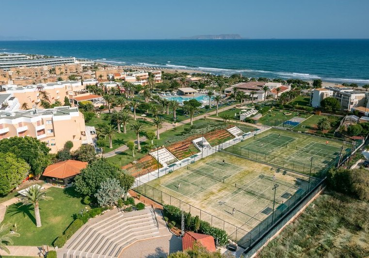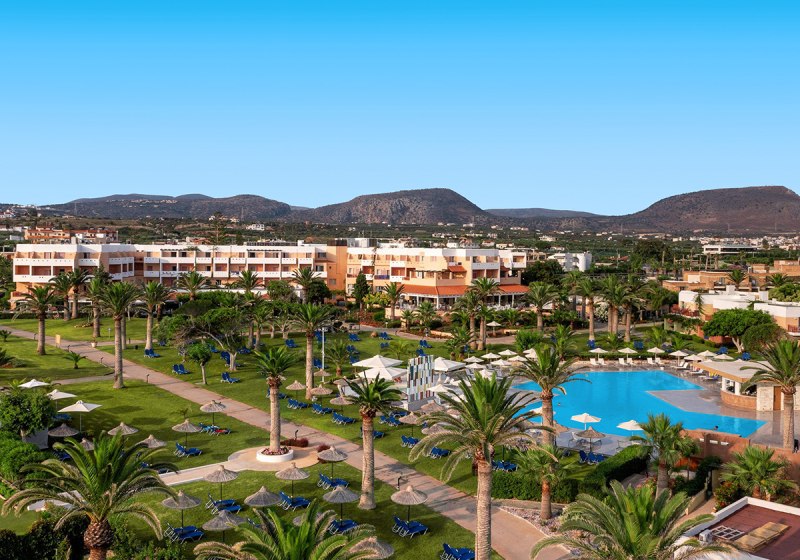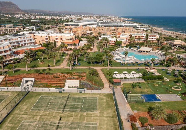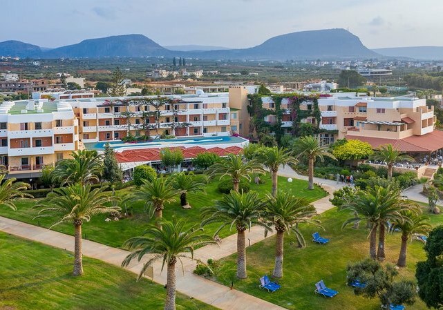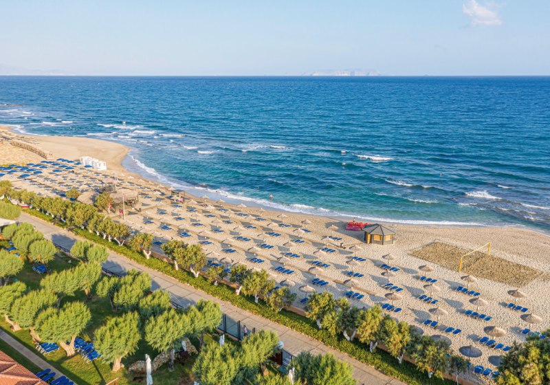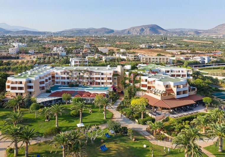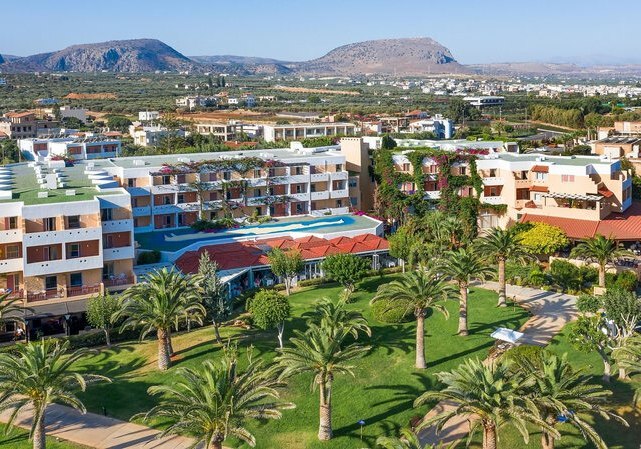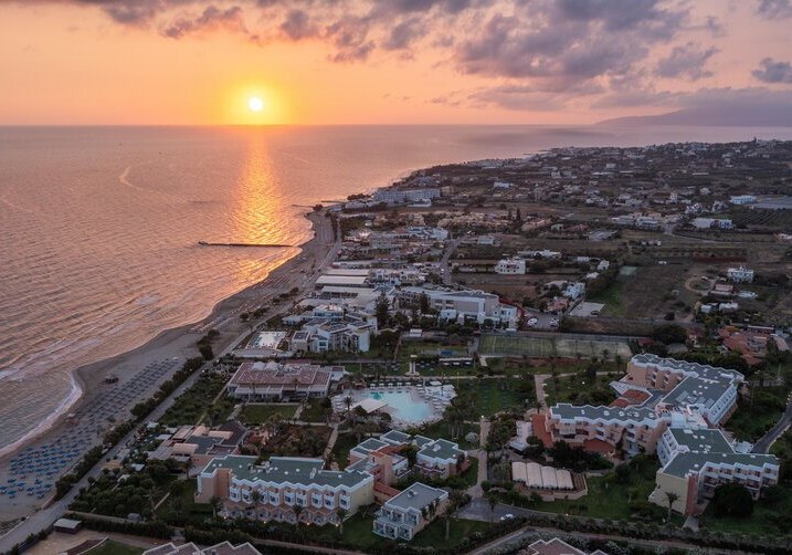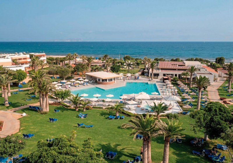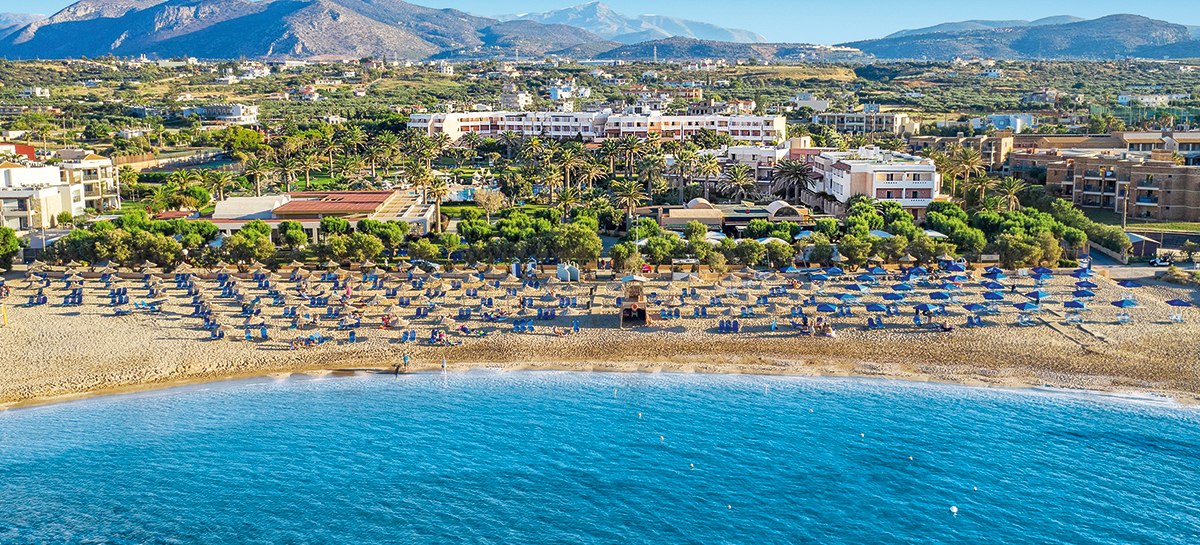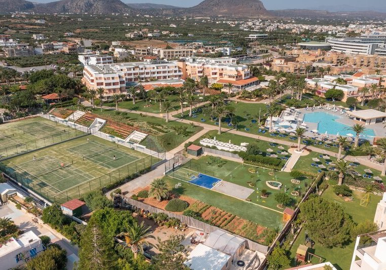 Im Anissa Beach & Village Hotel wohnt Ihr direkt am Sand- und Kiesstrand von Anissaras – mit kurzen Wegen vom Zimmer zum Wasser, viel Platz im Garten und einer Atmosphäre, die zwischen gelassenem Strandgefühl und lebendiger Resort-Energie pendelt. Das Haupthaus und das zweistöckige Nebengebäude Knossos rahmen weite Grünflächen, dazwischen ziehen sich Wege zu Pool, Taverne, Bars und den Sportbereichen. So fühlt sich Euer Tag strukturiert, aber frei an: ein klarer Rhythmus aus Meer, Genuss und Bewegung.