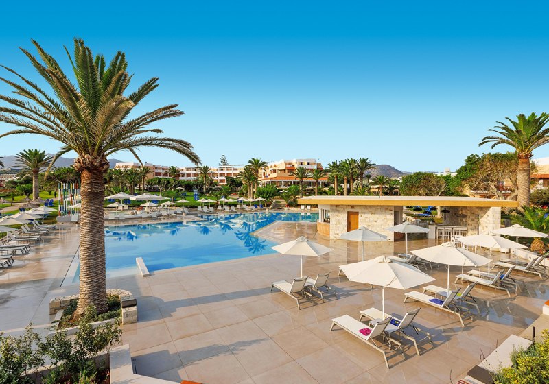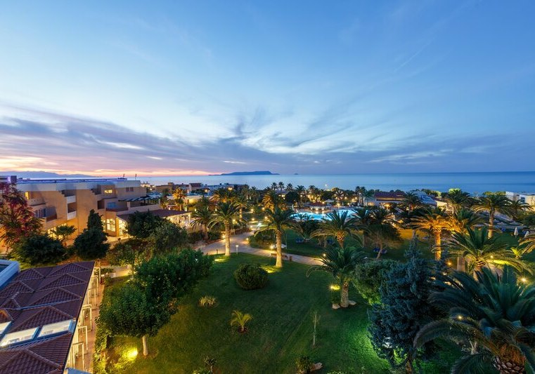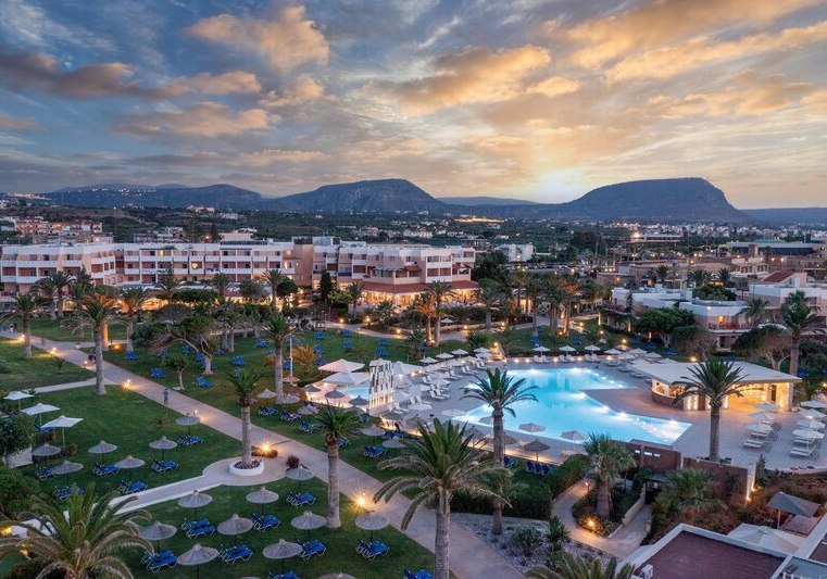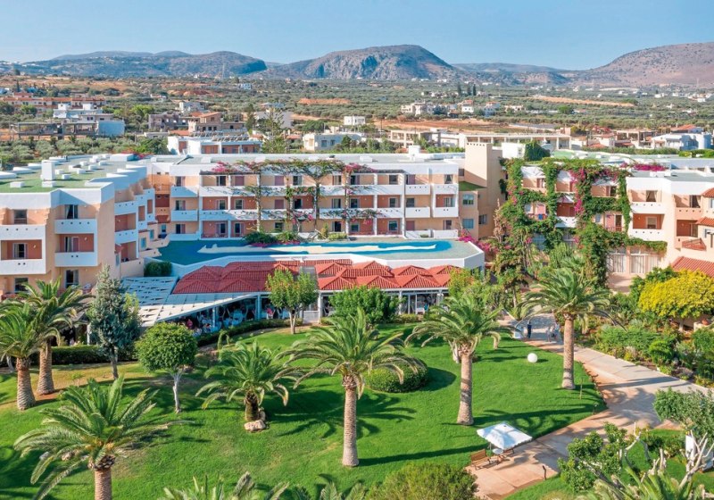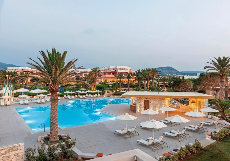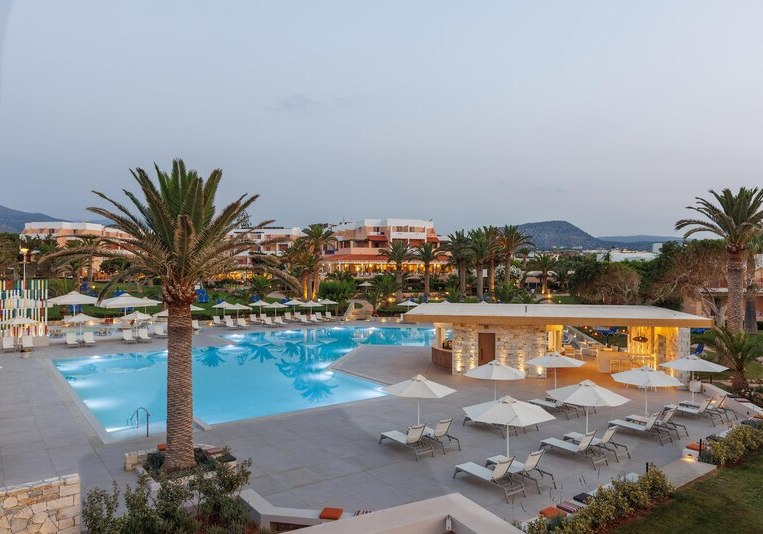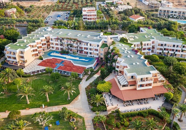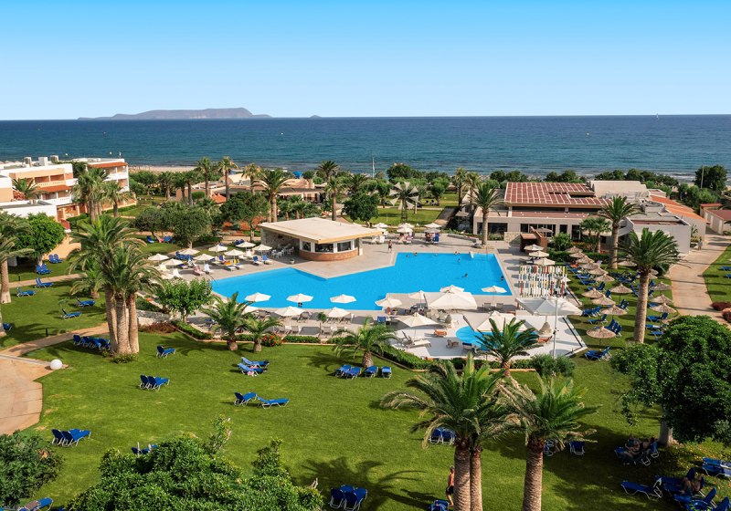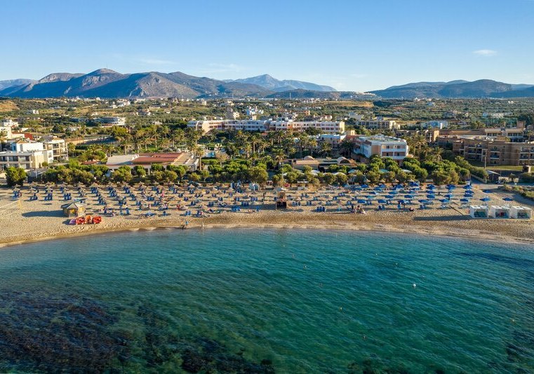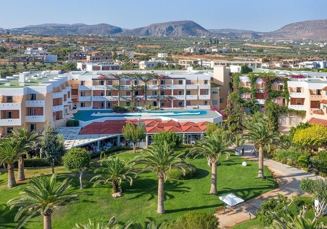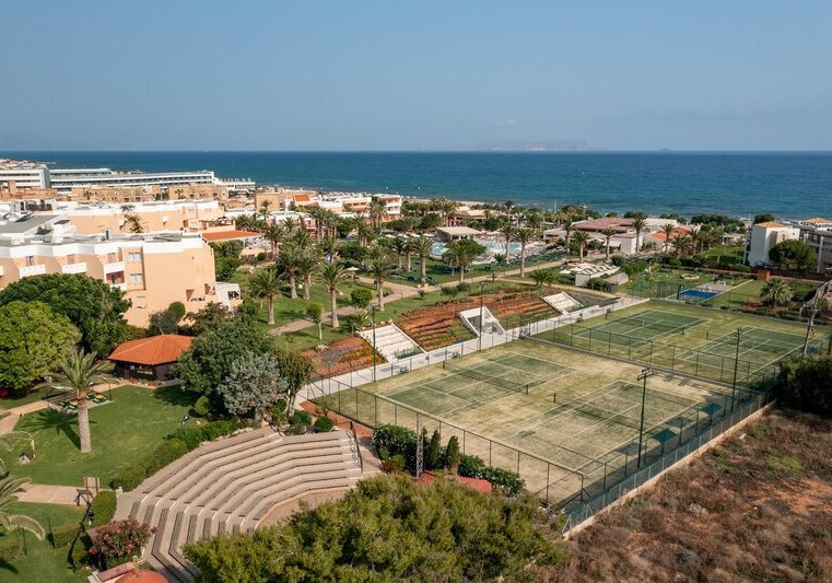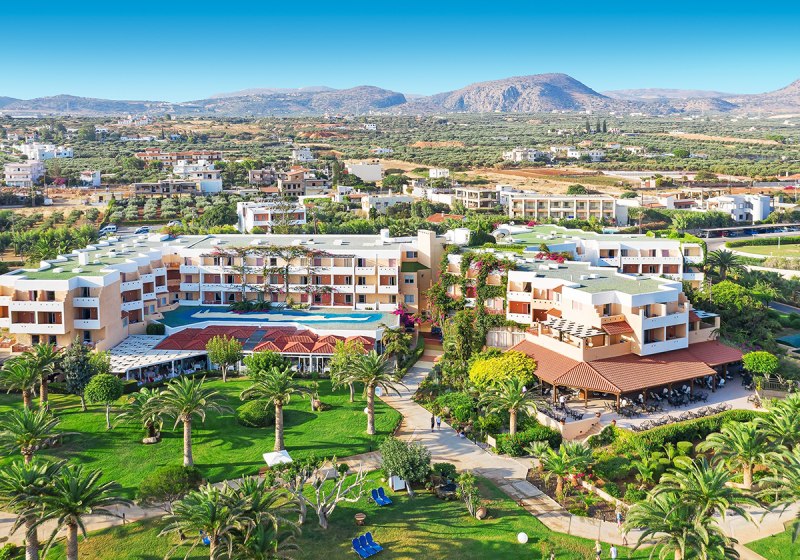 Im Anissa Beach & Village Hotel wohnt Ihr direkt am Sand- und Kiesstrand von Anissaras – mit kurzen Wegen vom Zimmer zum Wasser, viel Platz im Garten und einer Atmosphäre, die zwischen gelassenem Strandgefühl und lebendiger Resort-Energie pendelt. Das Haupthaus und das zweistöckige Nebengebäude Knossos rahmen weite Grünflächen, dazwischen ziehen sich Wege zu Pool, Taverne, Bars und den Sportbereichen. So fühlt sich Euer Tag strukturiert, aber frei an: ein klarer Rhythmus aus Meer, Genuss und Bewegung.