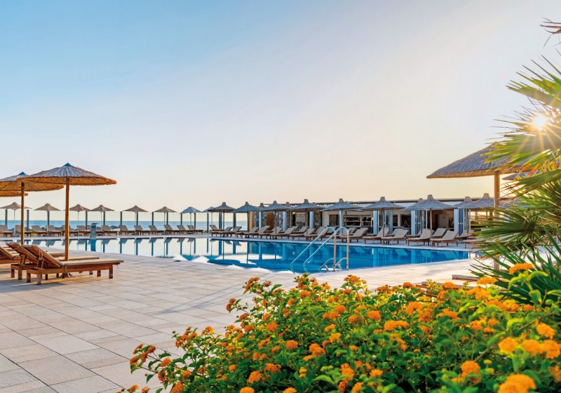 Im Außenbereich erwarten Euch ein Pool und ein separater Kinderpool, Sonnenterrasse, Gartenbereiche sowie ausreichend Liegen, Schirme und Badetücher – am Pool und am Strand. Eine Poolbar, Außenmöbel und ein ruhiger TV-Raum ergänzen die Gemeinschaftsflächen. Praktisch: Parkplatz und Ladestation für Elektrofahrzeuge. Highlight: Durchdachte Services vom Check-in bis zum Transfer.