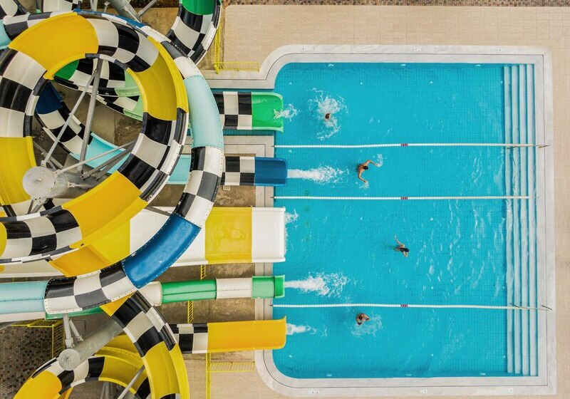 Innen entspannt Ihr im beheizten Hallenbad oder Whirlpool; draußen warten 17 Pools, fünf Kinderbecken und der 4.000 m² Wasserpark mit fünf Rutschen und Wasserspielen. Ein Fitnesscenter ist an Bord. Für Events bietet das Resort ein großzügiges Konferenz‑Setup mit 28 Räumen auf etwa 6.000 m². Baujahr 1975, zuletzt 2023 renoviert – ein Haus mit Geschichte, das technisch und optisch aktualisiert wirkt. Highlight: Großzügige Infrastruktur von Spa bis Konferenzzentrum.