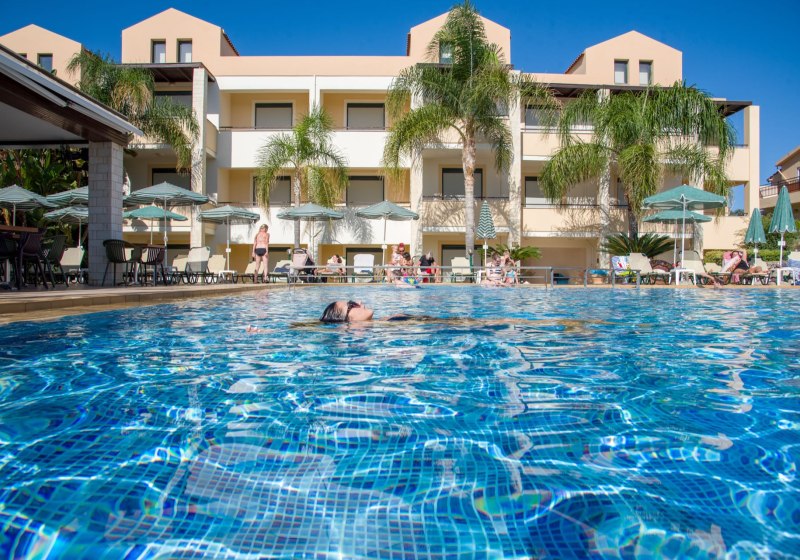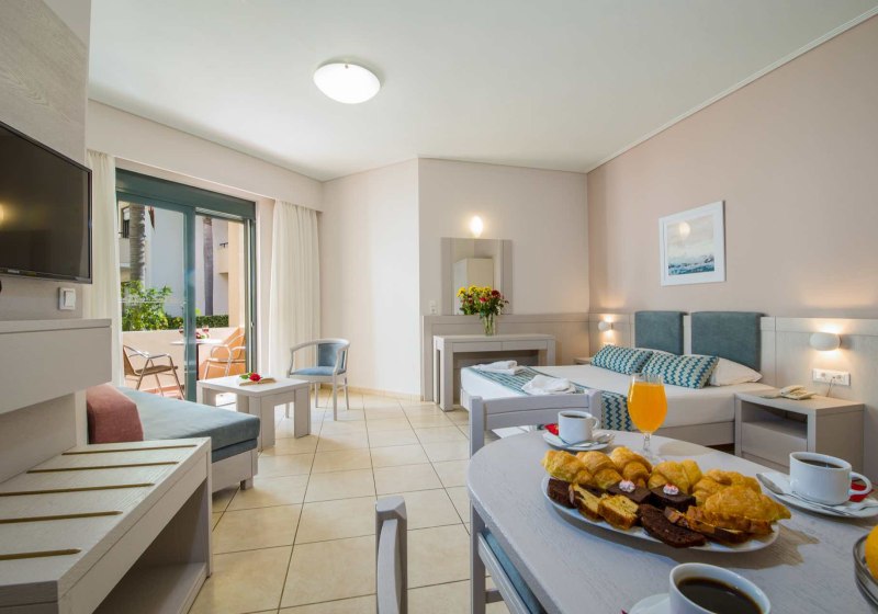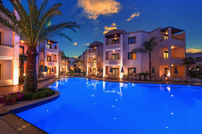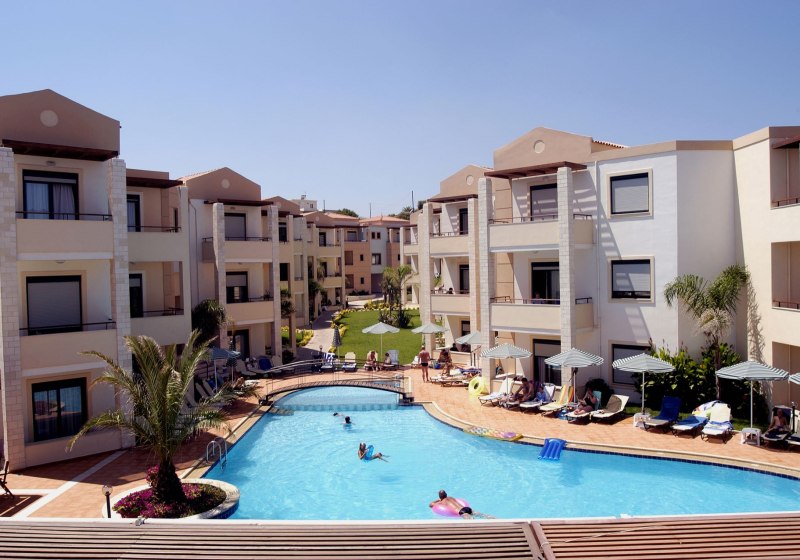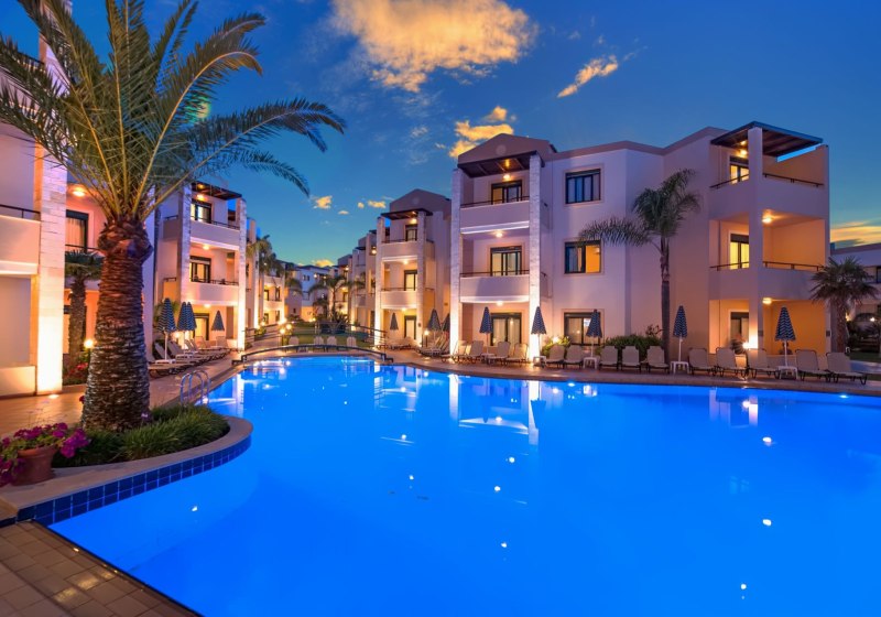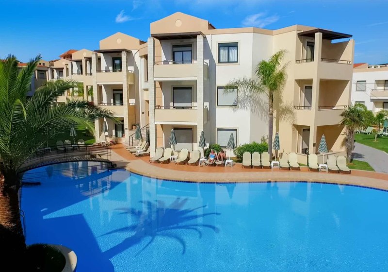 Im Creta Palm wohnt Ihr in Stalos auf Kreta, nur einen kurzen Spaziergang vom Sandstrand entfernt. Die Anlage wirkt übersichtlich und freundlich, mit zwei Süßwasserpools, integrierten Kinderbecken und sonnigen Terrassen. WLAN nutzt Ihr in der gesamten Anlage, während die 24-Stunden-Rezeption Euch aufmerksam begleitet. Familien profitieren von Apartments mit separatem Schlafzimmer und Babybetten auf Anfrage.
