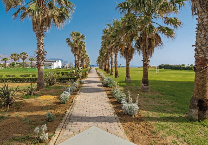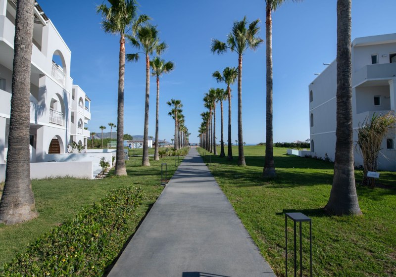 Im Delfina Tropic Beach wohnt Ihr direkt am breiten Sandstrand von Kavros. Der Strand ist mit der Blauen Flagge ausgezeichnet, das Meer fällt flach ab. Das Haus ist ab 15 Jahren buchbar und richtet sich damit klar an ruhesuchende Paare, Freundinnen und Freunde sowie erwachsene Strandliebhaber. 112 Zimmer verteilen sich auf Haupthaus und Bungalows; dazwischen liegen Wege, Grünflächen und der Außenpool mit bequemen Liegen und Sonnenschirmen. WLAN ist inklusive, die Rezeption arbeitet rund um die Uhr, und kostenfreie Parkplätze machen Eure Anreise entspannt.