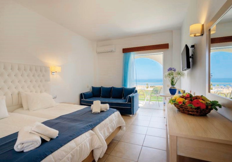 Der Tag beginnt locker am Buffetrestaurant und verläuft zwischen Strand und Poolbar. Später wechselt Ihr an die Beachbar, hört dem Wellengang zu und blickt Richtung Georgioupolis, nur wenige Kilometer entfernt. Die Atmosphäre bleibt unaufgeregt, die Ausstattung durchdacht: vom Minikühlschrank im Zimmer bis zu Badetüchern (gegen Gebühr) und akzeptierten Kreditkarten. Haustiere sind nicht erlaubt, der Fokus liegt vollständig auf komfortablen Tagen am Meer.