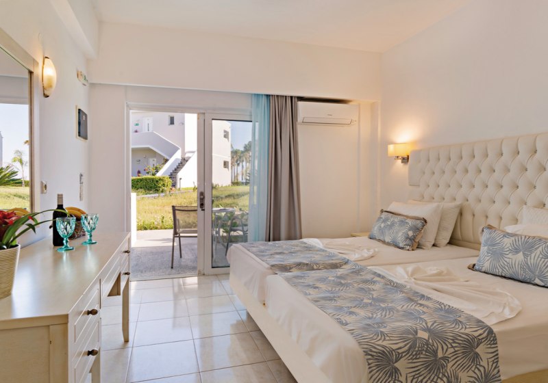 Alle Zimmer bieten Bad oder Dusche/WC, Pflegeprodukte und Föhn, individuell regulierbare Klimaanlage, Telefon, Sat-TV, kostenfreies WLAN sowie Mietsafe. Minikühlschrank und Kaffee-/Teezubereiter sorgen für kleine Pausen zwischendurch. Auf dem Balkon oder der Terrasse atmet Ihr die Meeresluft; in den Superior-Zimmern kommt Meerblick hinzu, teils mit Sofa sowie Bademantel und Hausschuhen.