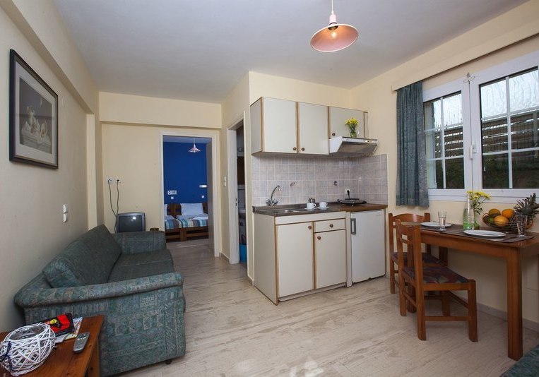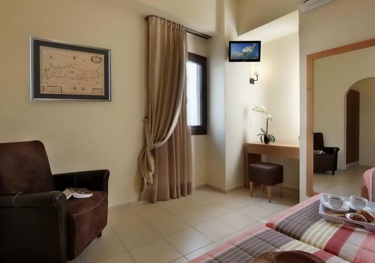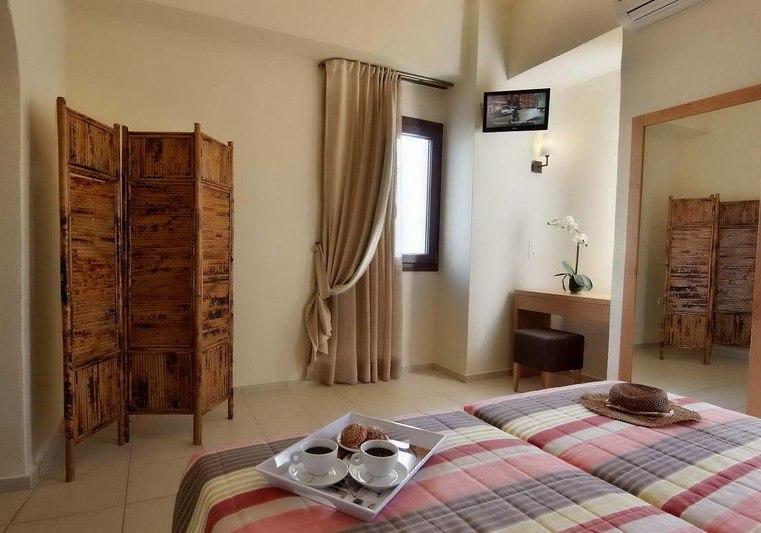 In Kokkini Chani wohnt Ihr zentral, nur 50 Meter vom Strand entfernt. Dort warten Liegestühle, Sonnenschirme und eine Strandbar – praktisch für kurze Wege zwischen Meer, Snack und Zimmer. Die Nähe zum Wasser prägt den Tag: erst der Spaziergang über den Strand, dann ein kühles Getränk an der Bar.