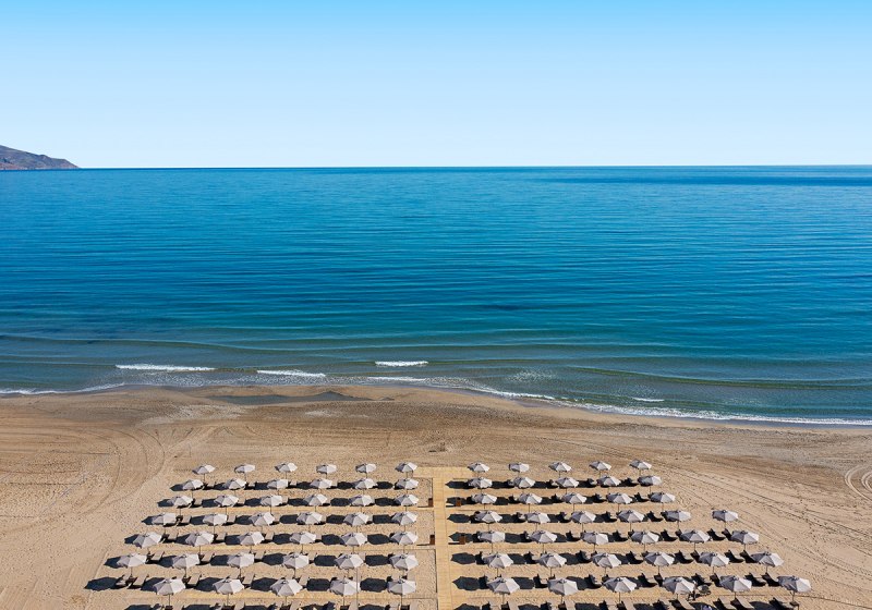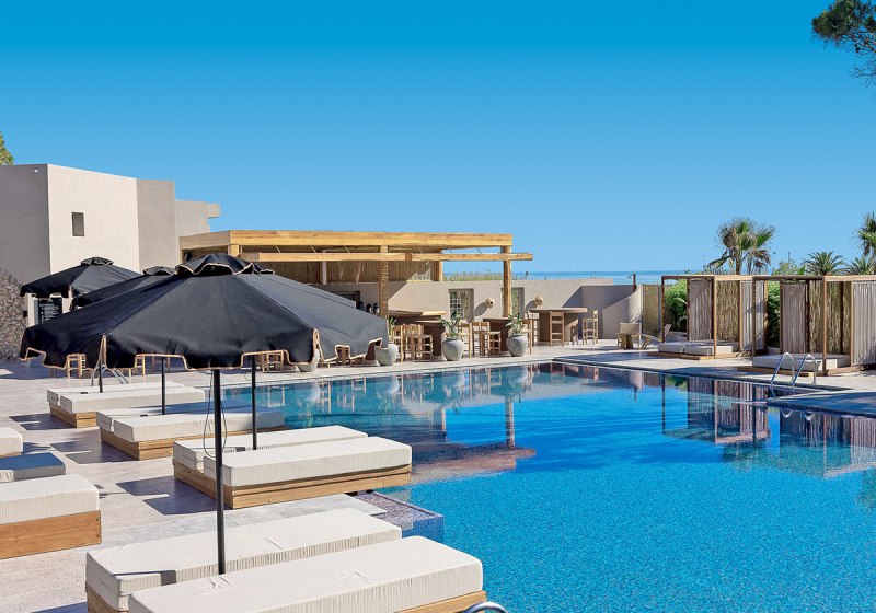 Im Eliros Mare Beachfront Poem Hotel wohnt Ihr direkt am langen Strand von Georgioupolis, mit feinem Sand und Auszeichnung der Blauen Flagge. Das Haus wurde im Winter 2020/21 komplett renoviert und wirkt entsprechend frisch. Die Anlage ist überschaubar, mit kurzen Wegen zwischen Pool, Strand und den geselligen Bereichen rund um Bars und Restaurant.