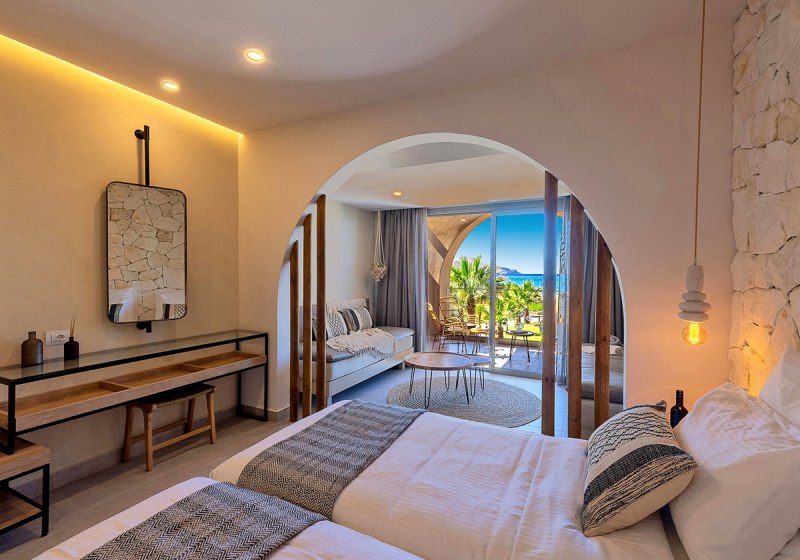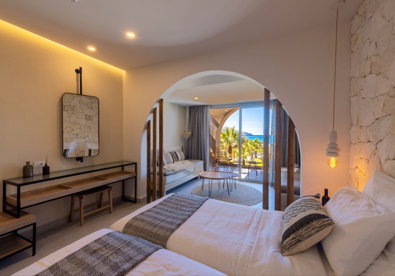 Ein Teil der Zimmer bietet Meerblick oder Seafront-Lage. Einige Kategorien verfügen über privaten Pool und eine Nespresso-Maschine. Juniorsuiten kombinieren Wohn- und Schlafbereich – angenehm, wenn Ihr mehr Raum schätzt oder mit Kind reist.
