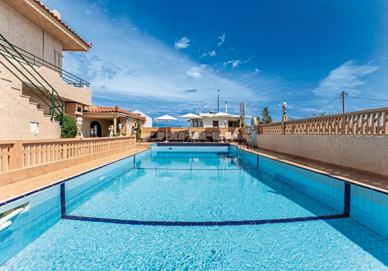 Erato Hotel steht für gelassene Tage zwischen Pool, Dachterrasse und Küste. Die Anbindung über Bus, die Nähe zu kleinen Sandbuchten und die klaren Hotelstrukturen erleichtern Eure Planung. Livemusik-Abende setzen stimmige Akzente, ohne die ruhige Grundstimmung zu überdecken.