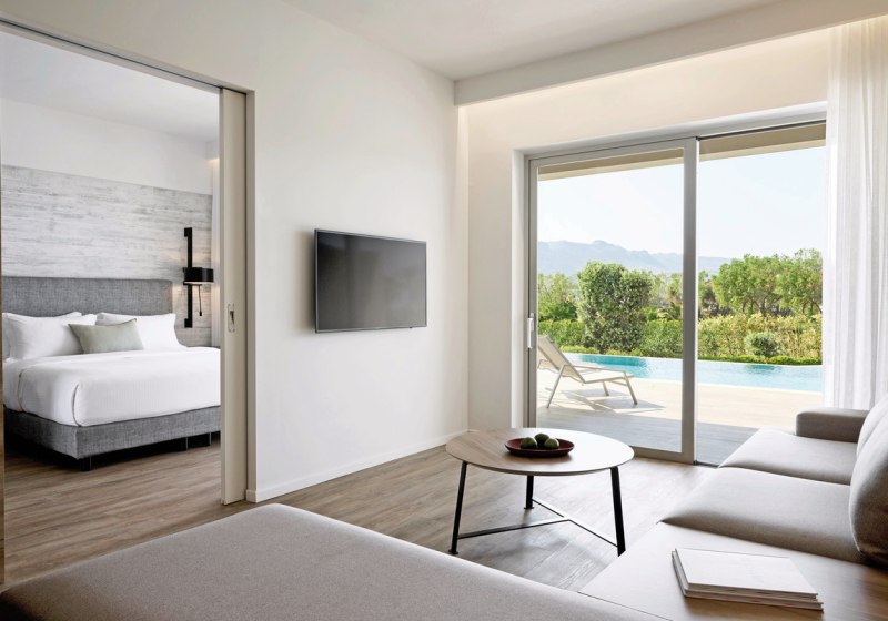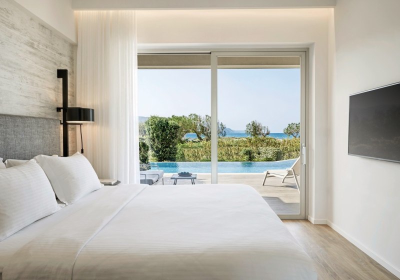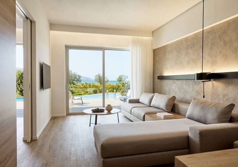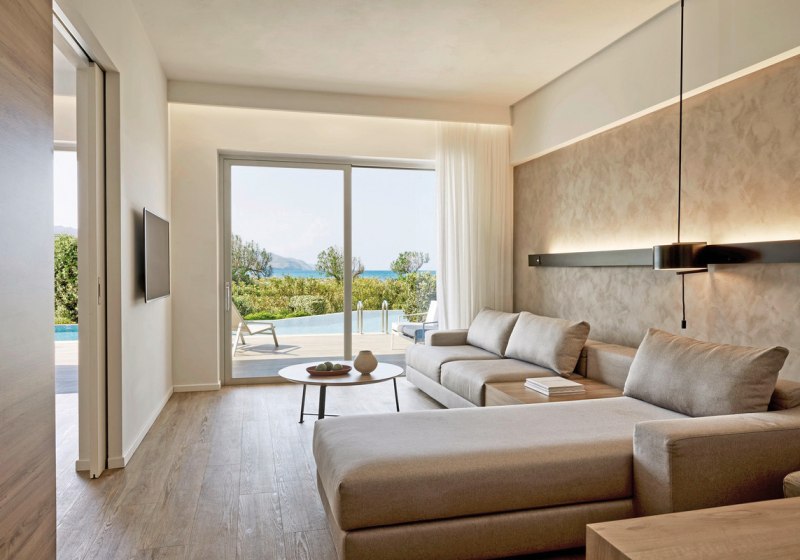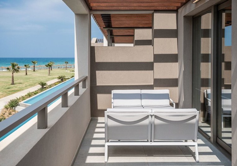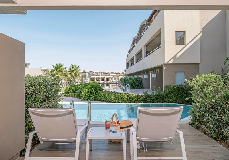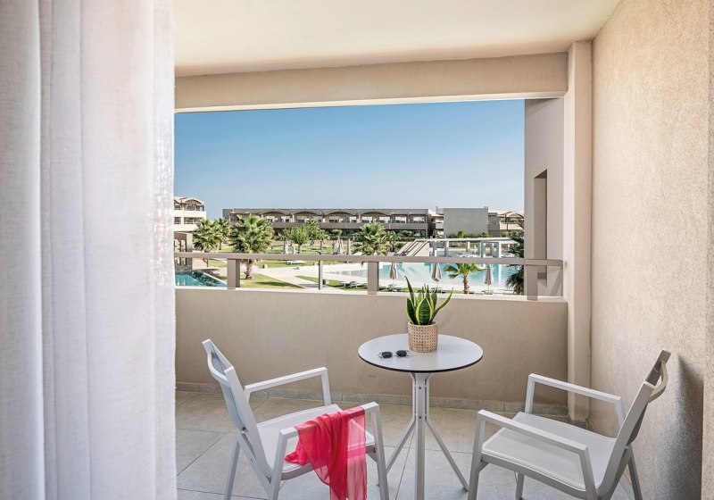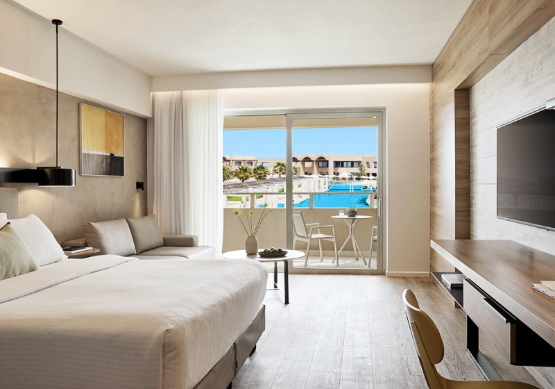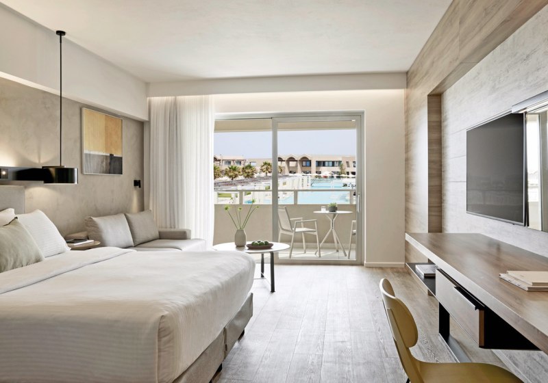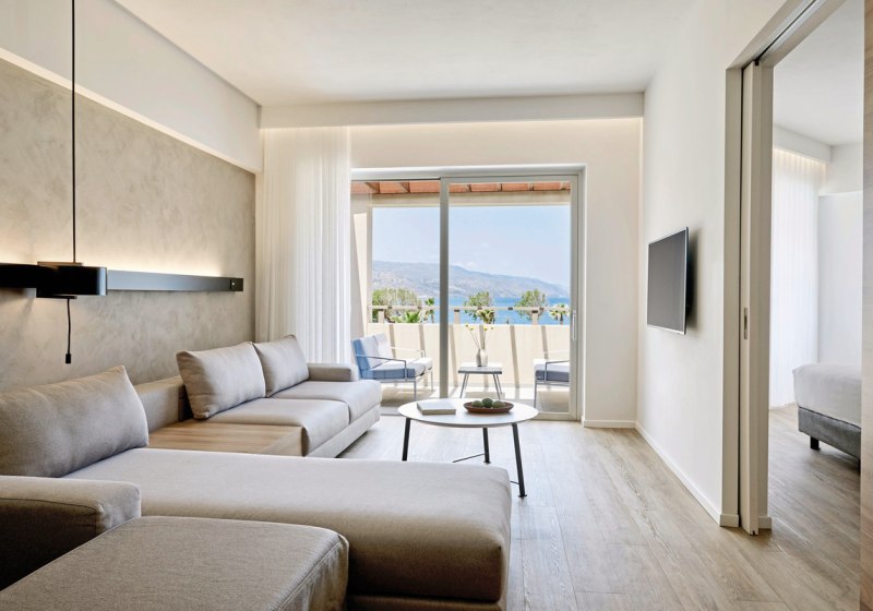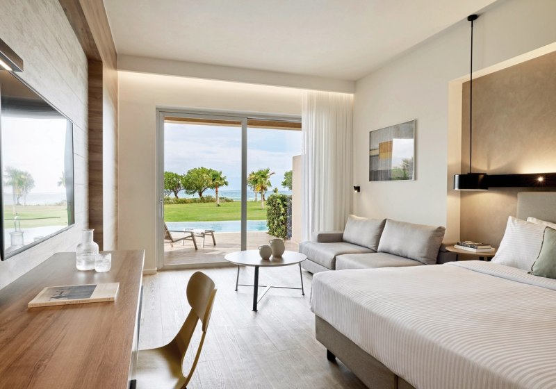 Bei den Blicken wählt Ihr zwischen Pool-, seitlichem oder direktem Meerblick; einige Einheiten bieten Sharing-Pool-Zugang. Juniorsuiten trennen Wohn- und Schlafbereich per Schiebetür. Familiensuiten verfügen über ein separates Schlafzimmer und ein zusätzliches Bad/Dusche. Suiten bieten einen separaten Wohn-/Schlafraum mit Verbindungstür. Highlight: Sharing-Pool-Optionen und Meerblickvarianten strukturieren die Auswahl klar.