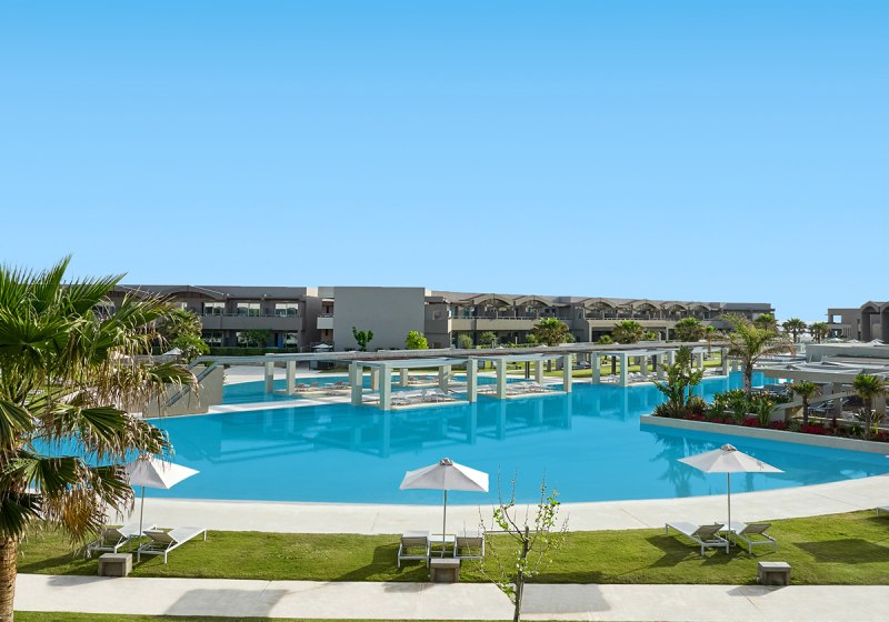 - Weitläufige Pools: Große Swimmingpool-Landschaft mit Liegen und Schirmen.