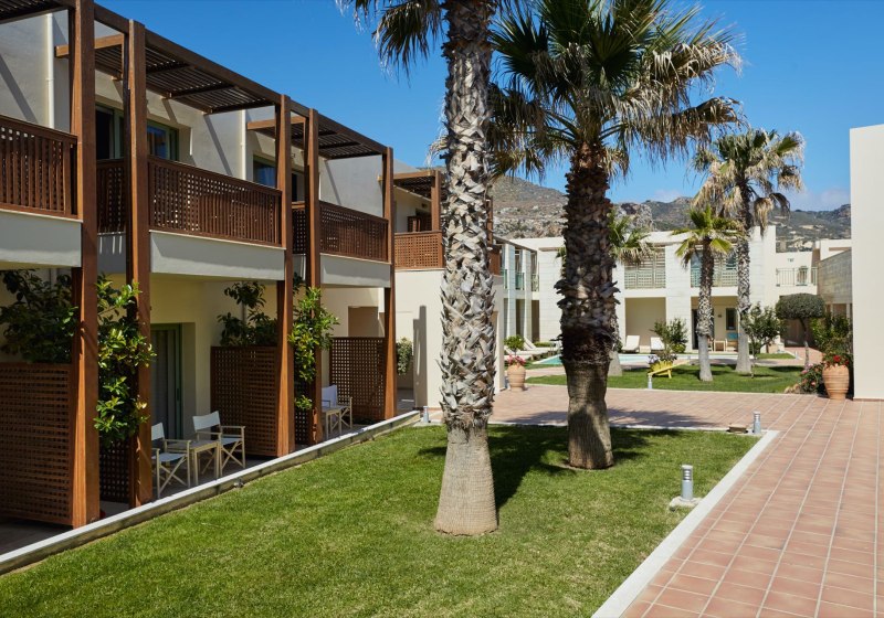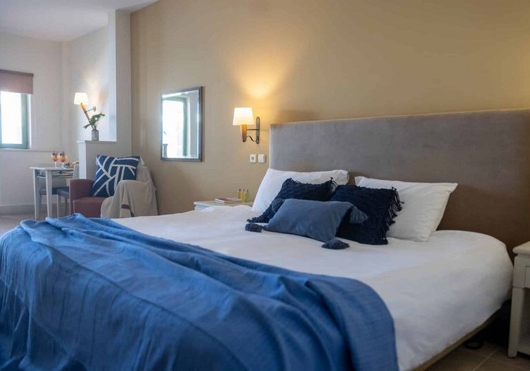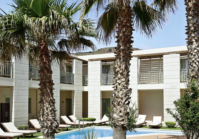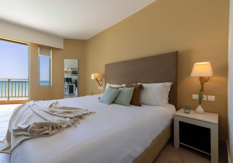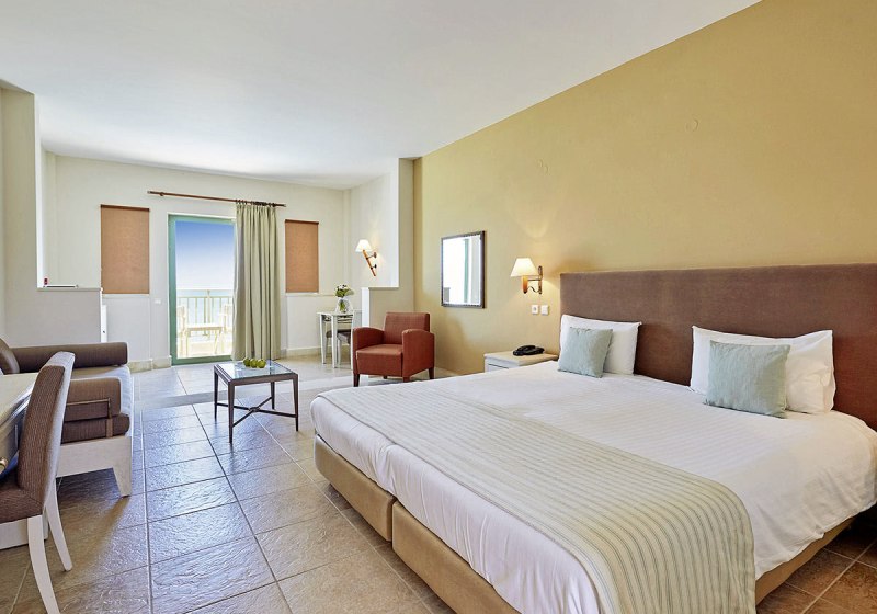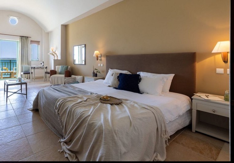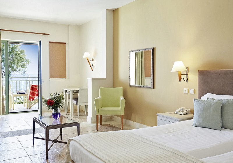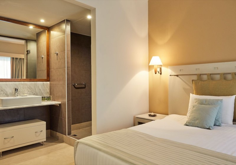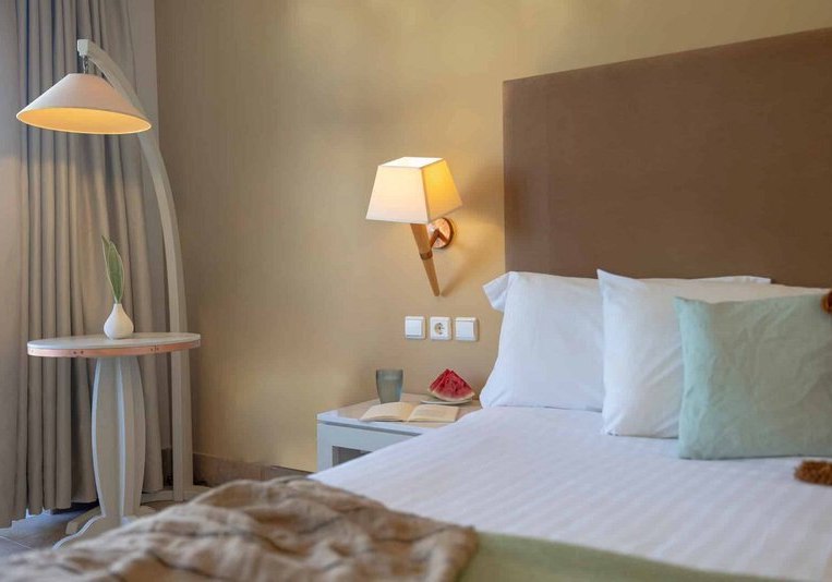 Ihr wohnt in Doppelzimmern, Juniorsuiten oder Suiten – alle mit Klimaanlage, Sat-TV, Marmorbad und Balkon oder Terrasse. Einige Kategorien bieten Meerblick, andere einen Sharing-Pool für den direkten Sprung ins Wasser. Das Design folgt klarer Funktionalität mit soliden Materialien.