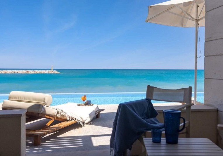 Zimmer mit Balkon oder Terrasse, teils Sharing-Pool oder Meerblick, und ein Spa mit Sauna, Dampfbad und Whirlpool runden das Bild ab. Sportkurse, Fitnessraum und dezente Livemusik setzen Akzente, ohne das Haus zu überladen. Ein Ort für fokussierte Erholung im Urlaub.