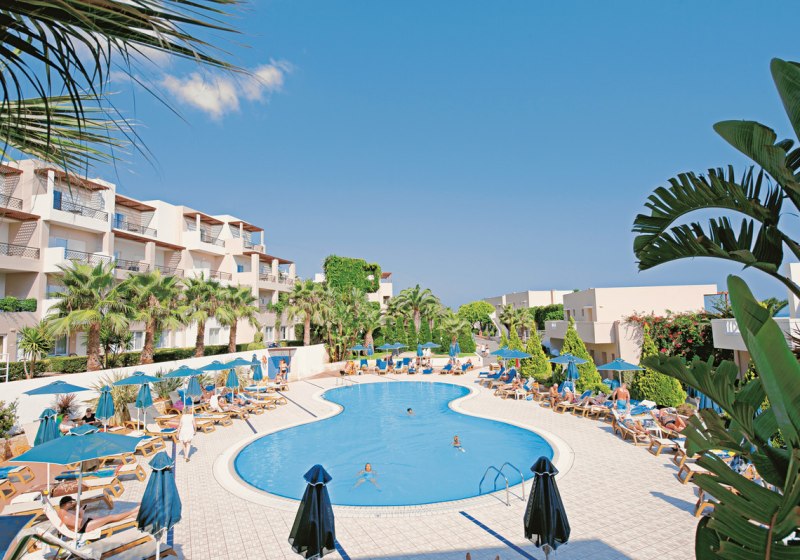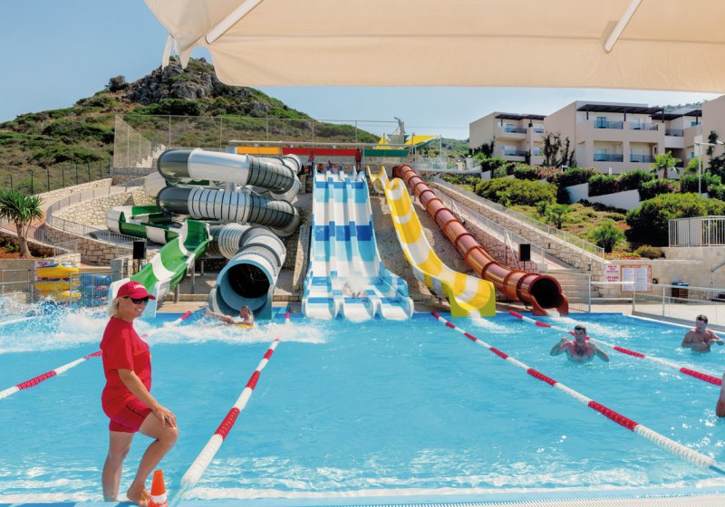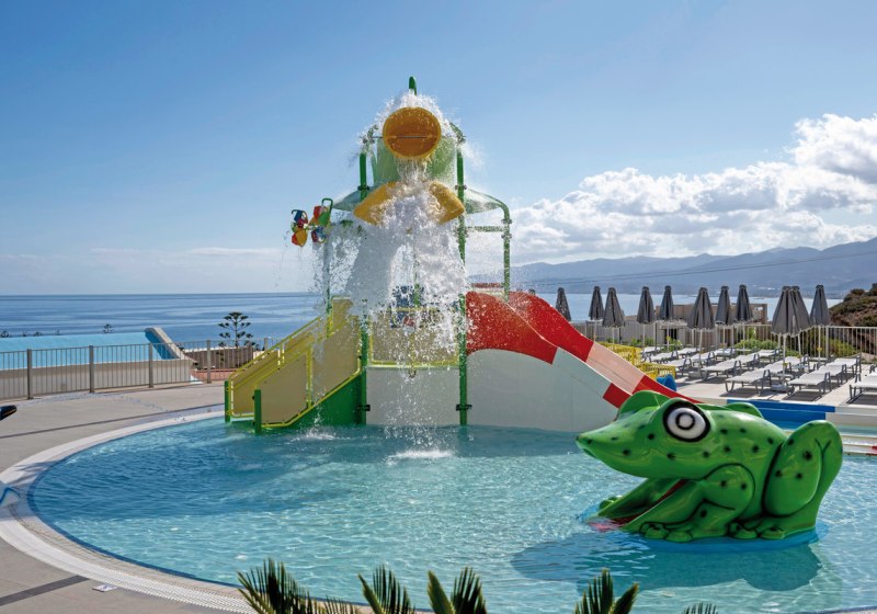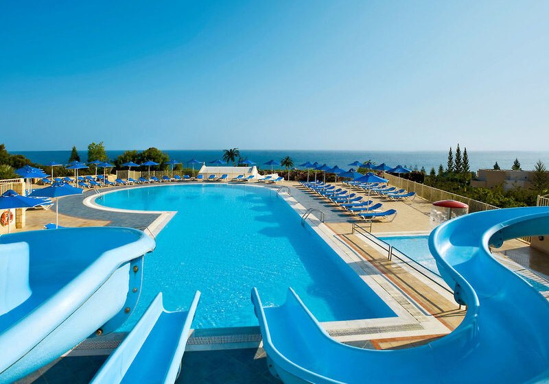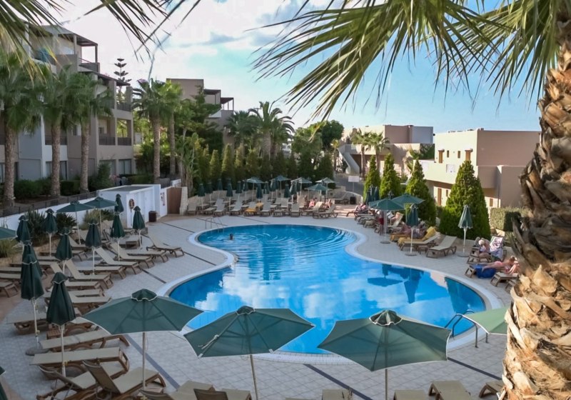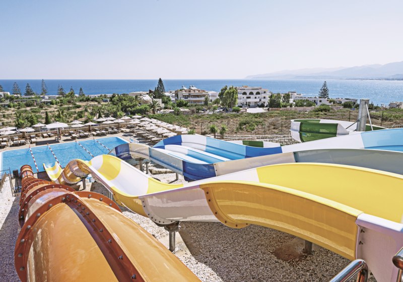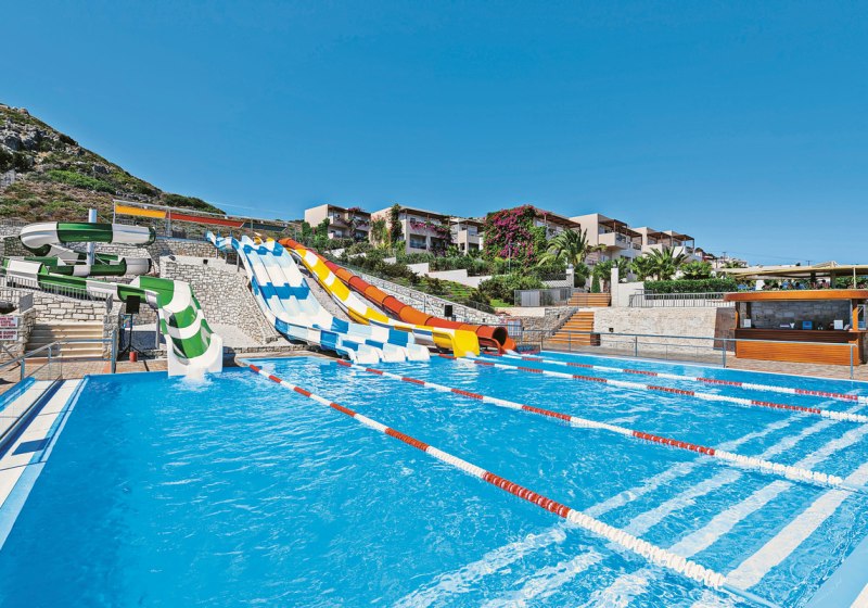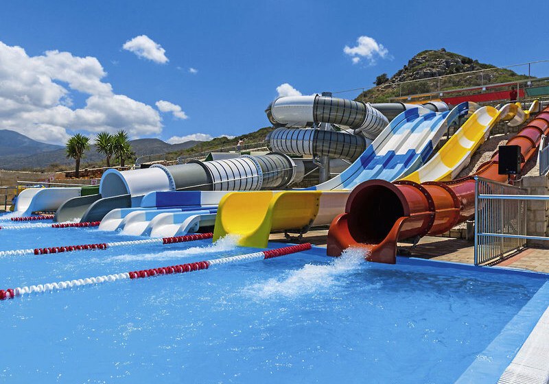 Im Grand Hotel Holiday Resort erlebt Ihr ein Resort, das Euch mit klar strukturierten Bereichen und viel Raum für unterschiedliche Bedürfnisse empfängt. Familien steuern den Aquapark mit Wasserrutschen und den Kinderpool an, während Ihr am Adults-Only-Pool bewusst zur Ruhe kommt. Über Wege zwischen Hauptpool, Sonnenterrasse und Lobby verteilt sich das Geschehen angenehm. Der Blick wechselt zwischen Gartenflächen und dem Blau der Pools, während Ihr Euch dank Beach-Shuttle flexibel zwischen Resort und Strand Stalida bewegt. Highlight: Vielseitige Poollandschaft mit Aquapark und Adults-Only-Bereich, klar voneinander getrennt.