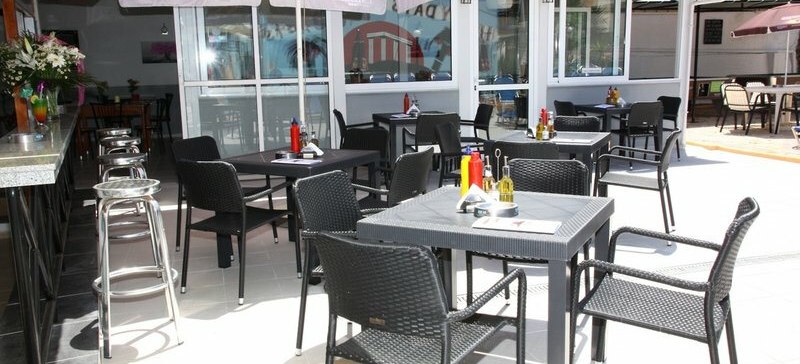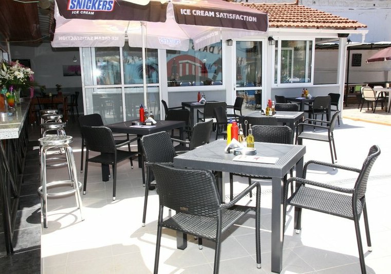 Die öffentlichen Bereiche sind kompakt angelegt: Rezeption und Lobby, TV-Raum, Garten mit Außenmöbeln sowie eine Sonnenterrasse gruppieren sich um zwei Süßwasserpools. Liegen und Sonnenschirme am Pool sind inklusive. WLAN ist in den öffentlichen Bereichen gegen Gebühr verfügbar; Parkplätze stehen kostenfrei bereit. Ein Minimarkt im Haus, Gepäckaufbewahrung und mehrsprachiges Personal runden das Bild ab.