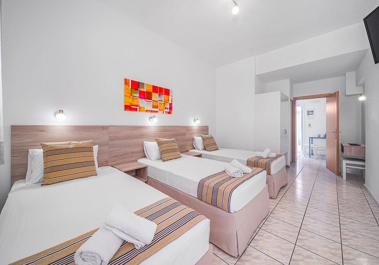 Ihr wohnt in Studios und Apartments mit Balkon oder Terrasse sowie gefliesten Böden. Die Kitchenette, Kühlschrank und Wasserkocher geben Euch Freiheit beim Tagesablauf. Ein Flachbild-Sat-TV gehört ebenso dazu wie Dusche und Haartrockner. Safe und individuell regulierbare Klimaanlage sind gegen Gebühr buchbar; ein Babybett erhaltet Ihr kostenlos. Die Zimmer sind funktional, luftig und aufgeräumt.