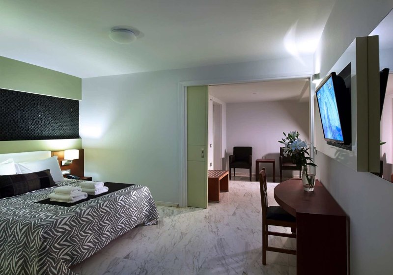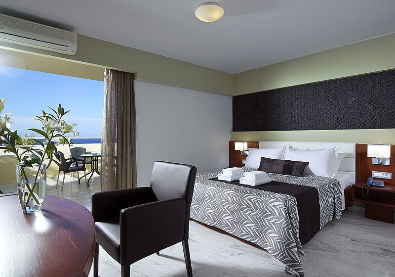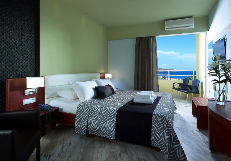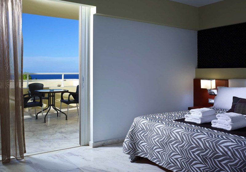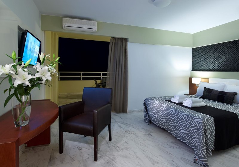 Ihr wählt zwischen Zimmern mit Balkon oder Terrasse, optional mit Meerblick. Zur Ausstattung zählen individuell regulierbare Klimaanlage, Sat-TV, Telefon, Föhn, Dusche/WC, Mietsafe und Minikühlschrank – funktional zusammengestellt für ruhige Nächte nach Strand und Pool.