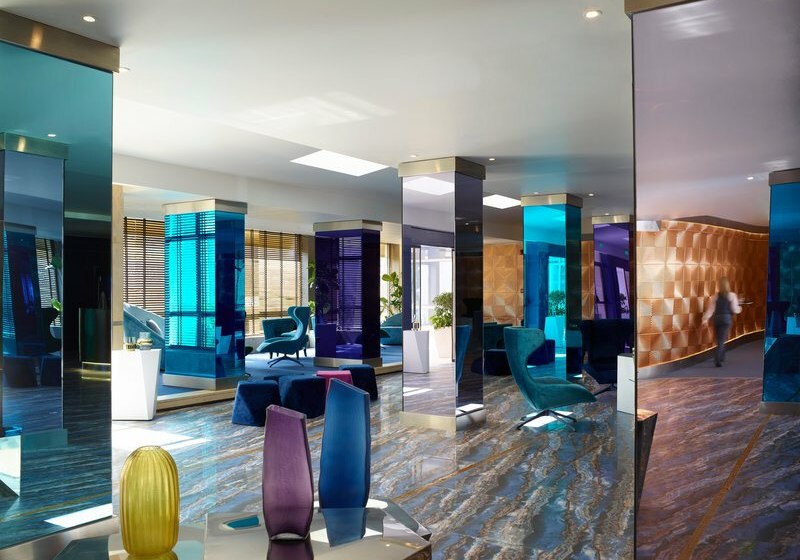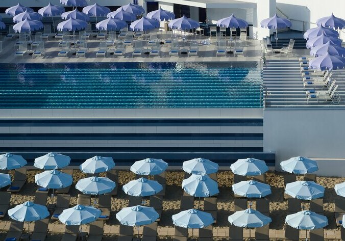 Die öffentlichen Bereiche wirken klar strukturiert: 24-Stunden-Rezeption, vier Lifte und offene Lounges, dazu Bibliothek und Sonnenterrassen. Zwei Süßwasserpools, darunter ein Infinity-Pool, werden von großzügigen Liegeflächen gesäumt. Liegen, Schirme und Badetücher stehen an Pool und Strand bereit, WLAN ist in der gesamten Anlage inklusive.