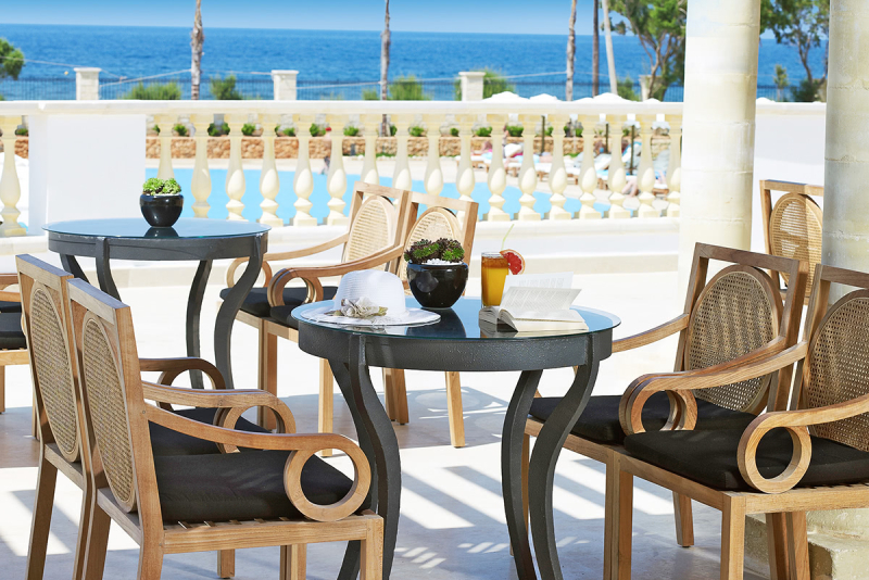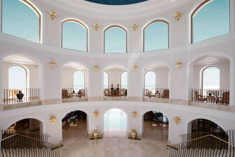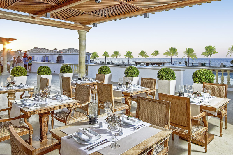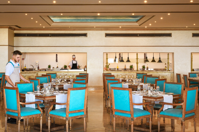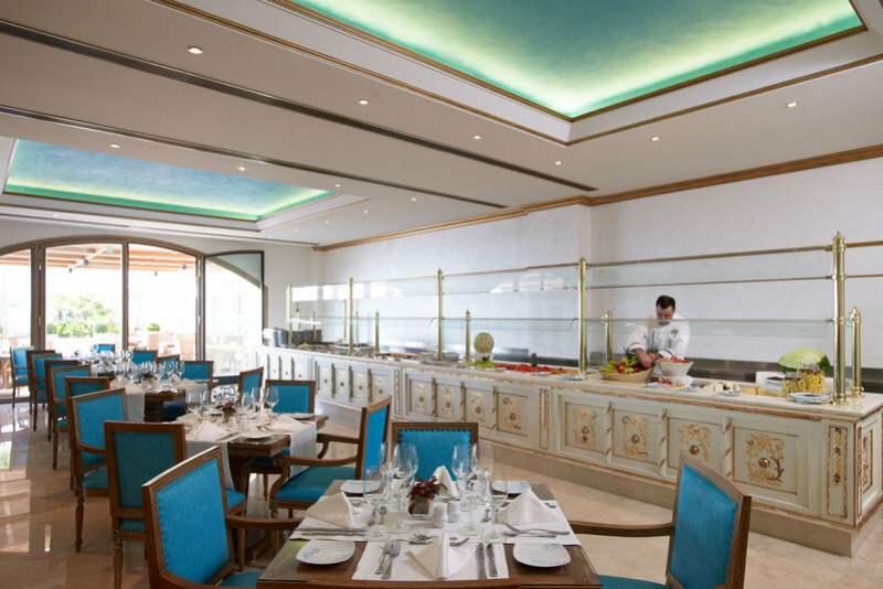 Das Hotel verfügt über insgesamt sechs Restaurants mit griechischer, internationaler, italienischer und asiatischer Küche sowie ein Grill-Steakhaus und ein Fischrestaurant. Zudem gibt es fünf Bars, darunter eine Poolbar und Champagner-, Wein- und Sushi-Bar. In puncto Ernährung wird auch auf spezielle Bedürfnisse eingegangen, mit Angeboten wie Diätkost, glutenfreier, laktosefreier, veganer und vegetarischer Kost.Ausstattung