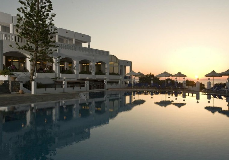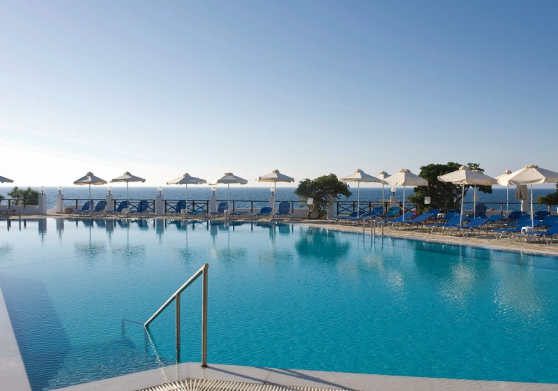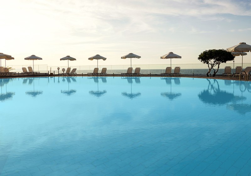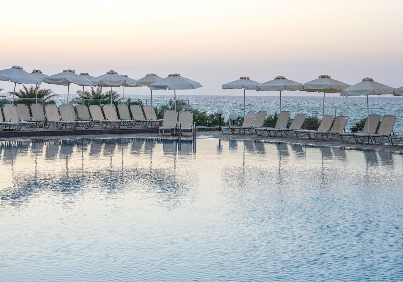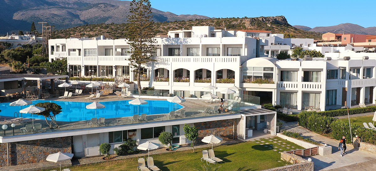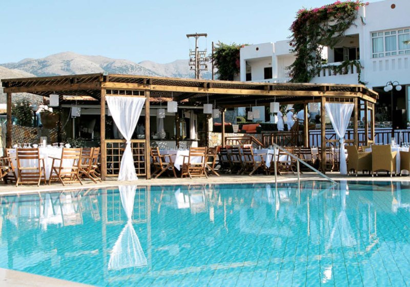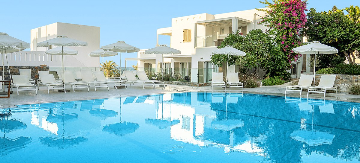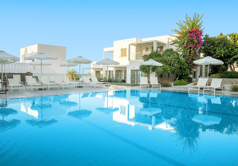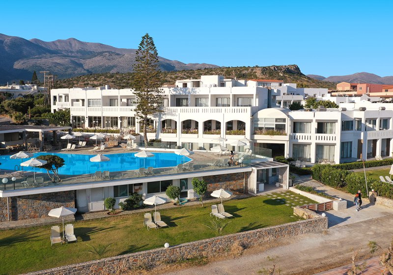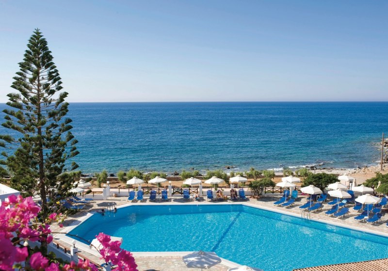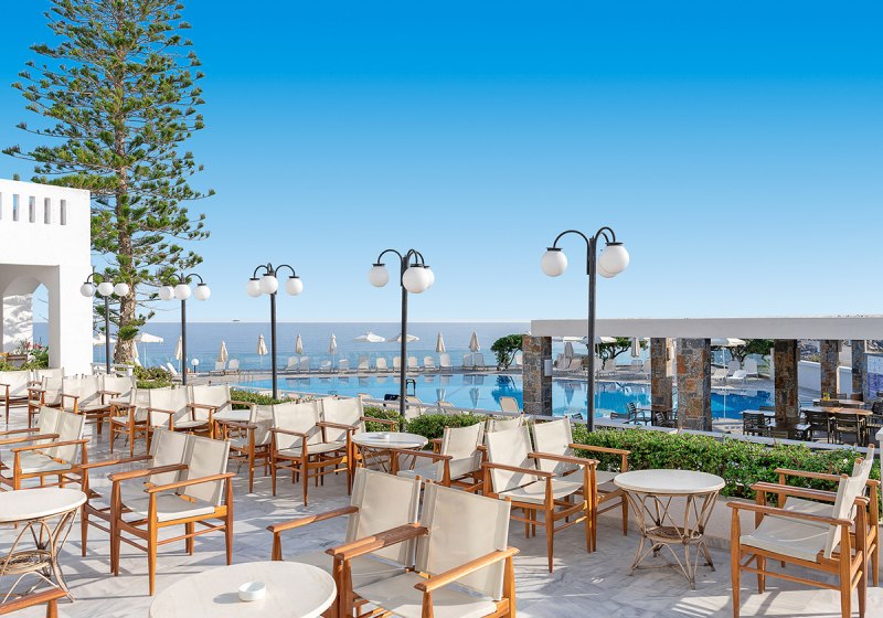 Im Maritimo Beach Hotel wohnt Ihr direkt am Meer und nur Schritte von Hafen und Badebucht entfernt. Die Anlage wirkt übersichtlich, mit Gartenbereichen und zwei Pools als ruhigem Drehpunkt eures Urlaubs. Kretische Abende mit Tänzen bringen regionale Kultur ins Haus, während Ihr tagsüber entspannt oder aktiv plant.