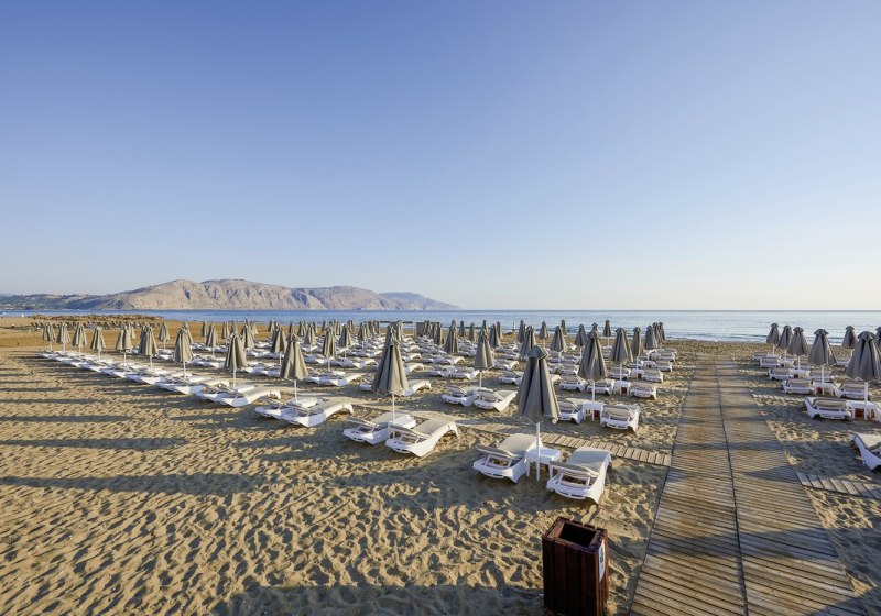 Ihr urlaubt in Kavros bei Georgioupolis, direkt am flach abfallenden Sandstrand mit Blauer Flagge. Der Strandzugang ist nahtlos, Liegen und Schirme stehen am Pool wie am Meer bereit. Gazebos am Strand lassen sich mieten, wenn Ihr Euch einen abgeschirmten Platz sichern möchtet.