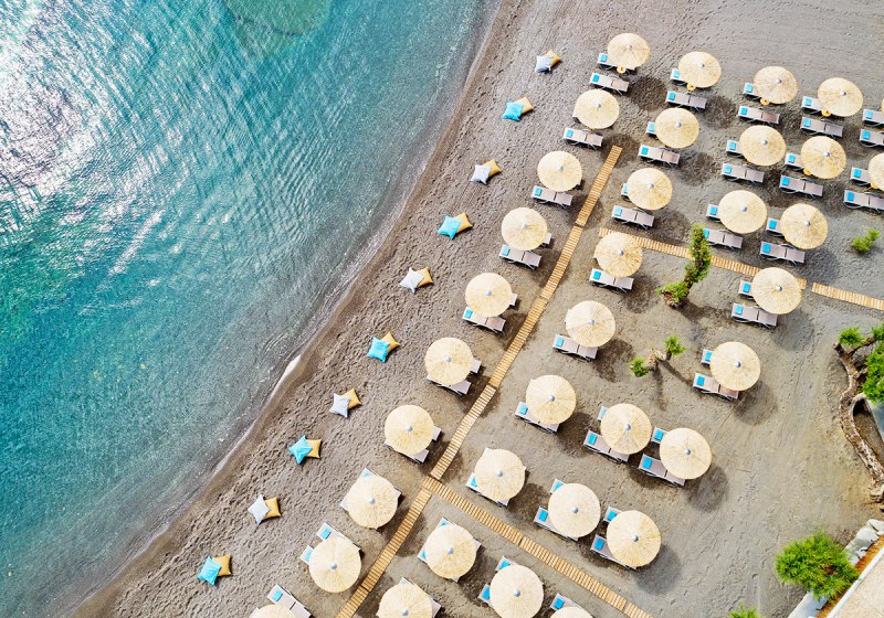 • Eigener Strand: Strand mit Liegen, Schirmen und Bar für kurze Wege.